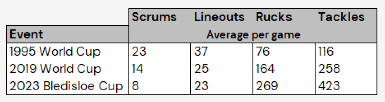 The latest edition of the Bledisloe Cup contained half the number of set-pieces, and between three to four times as many rucks built and tackles made as the tournament average back in 1995. Australia was a world champion team entering that competition, but lately it has been struggling to keep up with times.