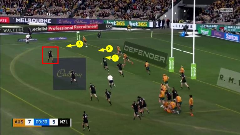 There is no obvious overlap, but the All Blacks are prepared to work their way upfield and allow events to unfold – until either a gap opens, or the Wallabies make a mistake. Right wing Mark Nawaqanitawase duly obliges by flying out of the defensive line, and 30 seconds later the All Blacks were touching down in the opposite corner: