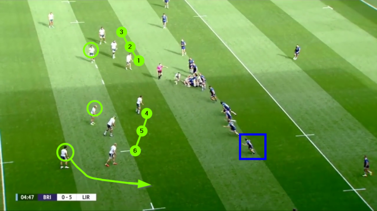In the first clip, wing Ollie Hassell-Collins runs all the way across the field towards the left 15m line, and as soon as Irish hit their mark, the three attackers appear in mutual support in the left 15-5m channel, with ex-Waratah centre Curtis Rona delivering the scoring assist.