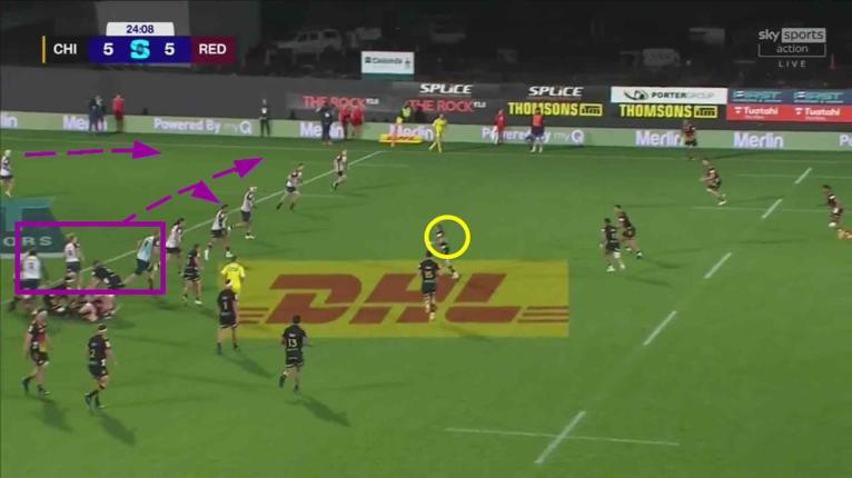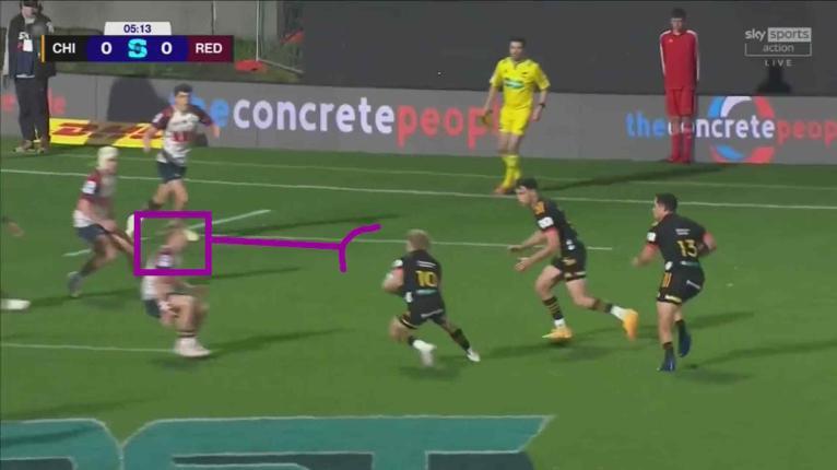 When you stand as deep as that, as much as ten metres off the gain-line at first receiver, the extra space and time created will be eaten by a defence in cover even more quickly than it is by the attack on the pass. The desperation to move the ball wide can be clearly felt in the final clip, with the Reds defenders all predicting the pass behind the front option and flooding through on to Emoni Narawa to build a winning counter-ruck after the tackle.