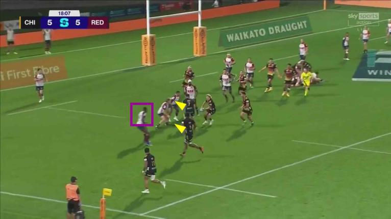 McDermott shoots out to cut down Damian’s space and decision-making time, either forcing him to take a first step back in towards the thick of the Reds D, or nudging the first five-eighth towards the lesser of two evils, the short pass on first phase in the clip. By the second phase, second row Connor Vest is taking on McDermott’s role, forcing McKenzie to track across field until he finds himself in a big hole, with his back to the defence and no dynamic support. At this point, all attacking momentum has been lost for the home side.
