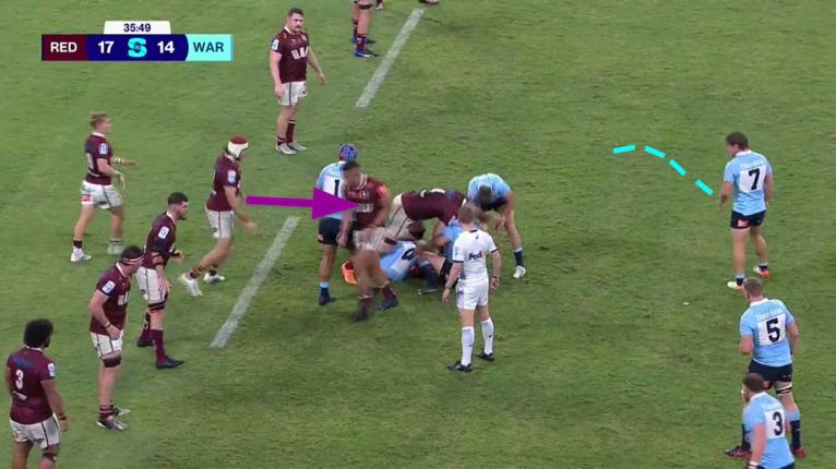 What did it look like in practice? Inevitably, much of the action with two livewire No 7s in direct opposition orbited around the breakdown. The Reds like to have McReight hang off the initial tackle so that he can attack the ball on the ground at the right moment. His first success came in the 20th minute of the game: