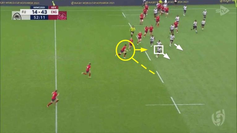 As the ball reaches England number 10 Zoe Harrison, the last Fiji defender is inside the far post, so there is no chance of the fullback covering the cross-kick over to left wing Claudia MacDonald.