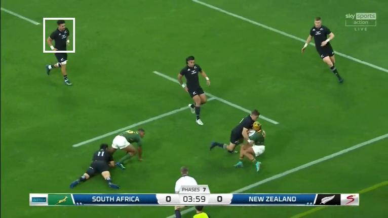 Over the seven phases that this South African attack lasts, both Cane and Savea make one tackle apiece, and have one shot each at the ball on the deck. But when the All Blacks regroup after each phase in defence, it is Ardie who is playing as the wider of the two back-rowers. Where Sam Cane sits in at first defender out from the ruck on five occasions, Ardie Savea gets further out, to second defender on four: