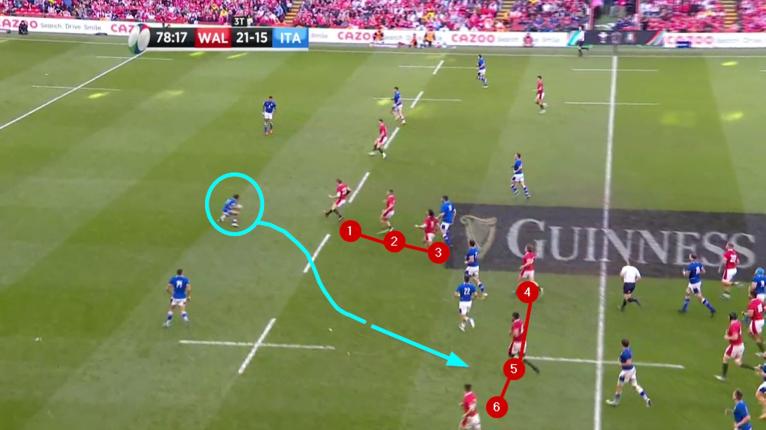 The chase to the other side is strung out over 15 metres of depth, which means that the defenders cannot help each other out. If Capuozzo has the vision to realise where the opportunity lies, and the footwork to take it, he can pick off single chasers one by one. In the event in question, he has, and he does. He spots the gap between the last forward (Taulupe Faletau) and the first back (Josh Adams) and the rest, as they say, is history.