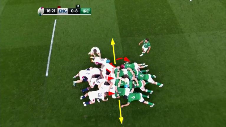 Five of the six front-rowers are pushing straight ahead as the ball goes in. The exception is English loose-head Ellis Genge, who is pushing in on his Irish opponent Tadhg Furlong at an angle, with his left shoulder advanced well ahead of his right.