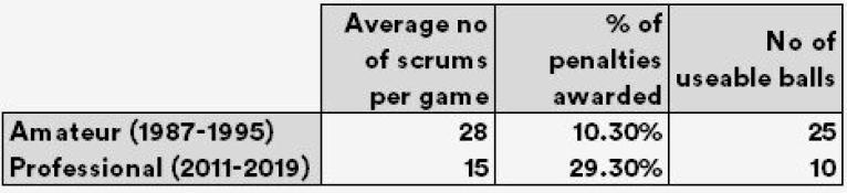 Over the first three World Cups, played before the game turned fully professional in 1987, 1991 and 1995, there were almost twice as many scrums set as there have been over the last three World Cups (in 2011, 2015 and 2019). The professional scrums generated three times the number of penalties awarded, and only 10 bits of useable ball – compared to 25 in the amateur era.