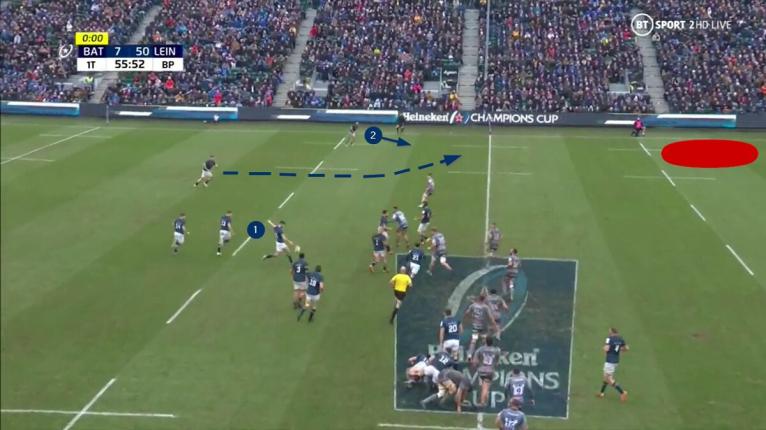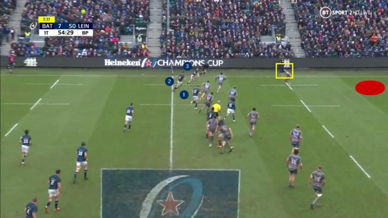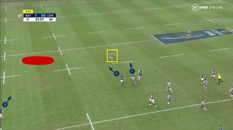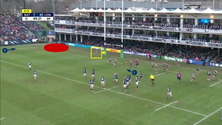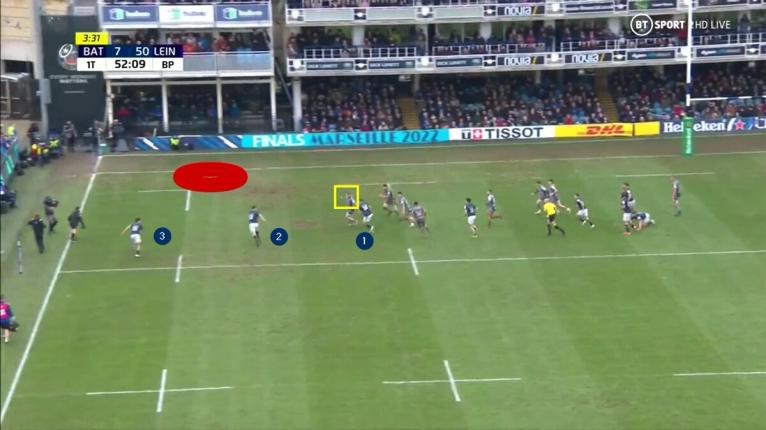 There is still a gaping hole on the right side of the Bath backfield, and Leinster right wing Jordan Larmour has sprinted all the way over to the ‘wrong’ side of the field to make the extra man and help create a turnover opportunity on chase.