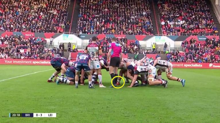 Julián Montoya makes an early ‘false strike’ for the ball, so that his foot is actually back in a pushing position by the time the ball enters the tunnel. The referee correctly gives a free-kick to the Bears, and all the Leicester forwards are merrily chugging ahead on the drive as Bristol scrum-half Harry Randall takes a quick tap and initiates a try-scoring counter.