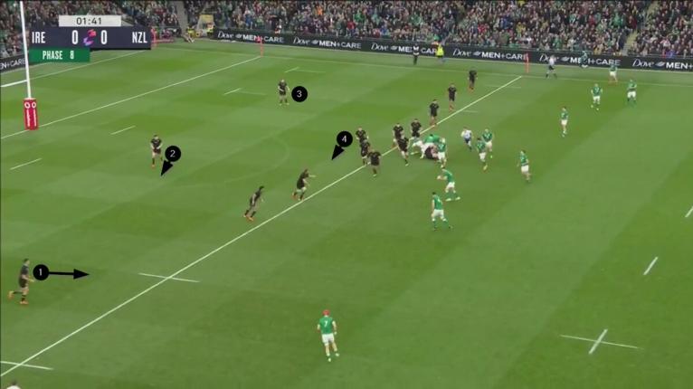 The Ireland wings play much higher upfield than their Kiwi counterparts and the halfback is in line, not behind the ruck. The extra numbers mean there is much greater potential for overmatching ball-carriers on the line and at the point of contact.