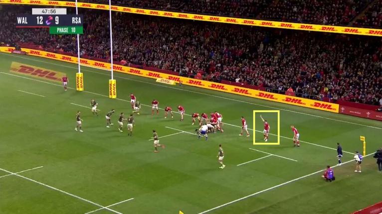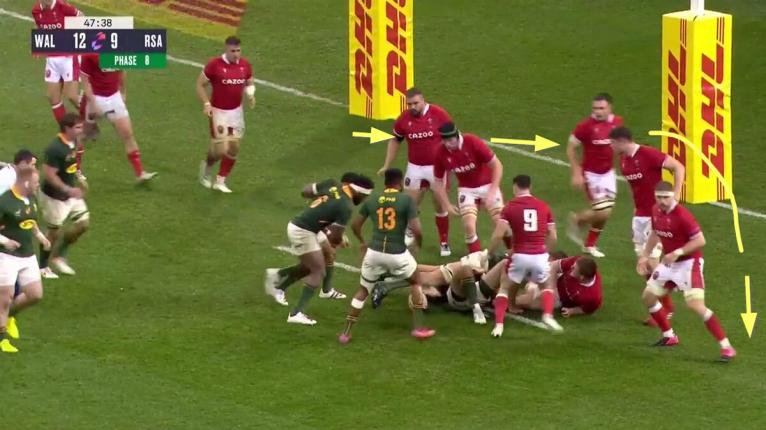 After two more phases to that side, the South African attack has been exhausted while the Welsh defence still maintains its width:
