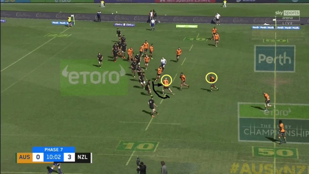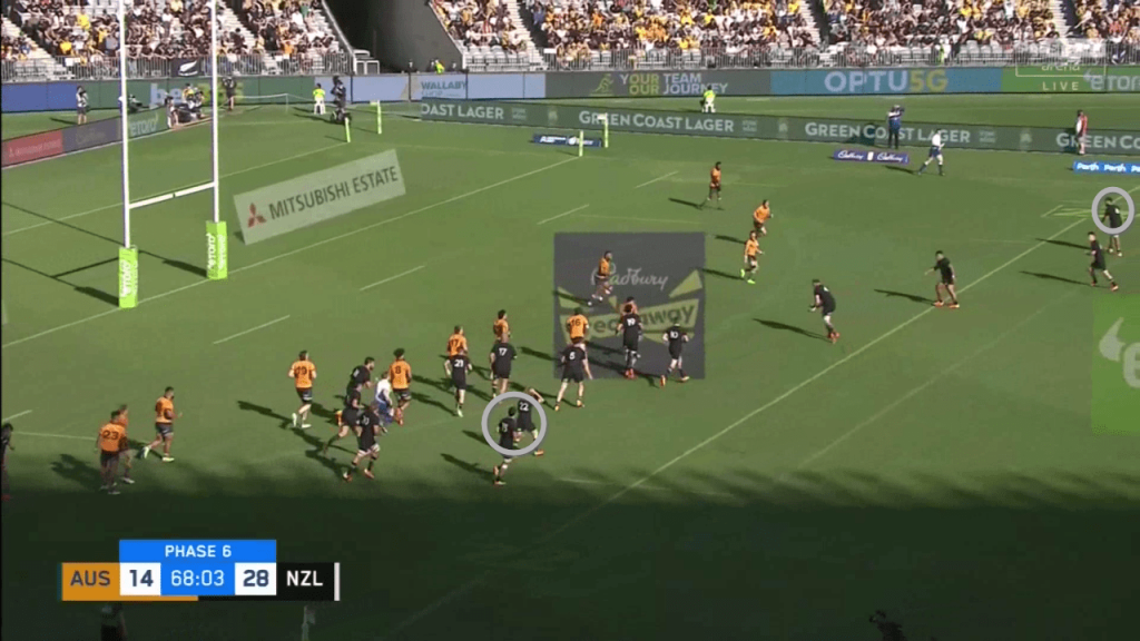 Lienert-Brown makes another good read, crashing down inside to knock over Michael Hooper. Two phases later, he is back in position on the right edge, creating another on-ball chance for Ethan Blackadder.