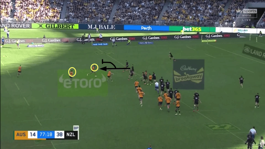 In the first example, Lienert-Brown defends high to force the play back inside, and the outcome is a slow, five-second ball for the Wallabies attack. In the second instance, he makes a good read on the circle ball from Matt Philip to Samu Kerevi, setting up an opportunity for the steal by Ardie Savea.