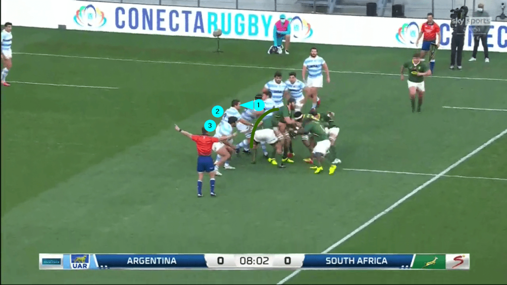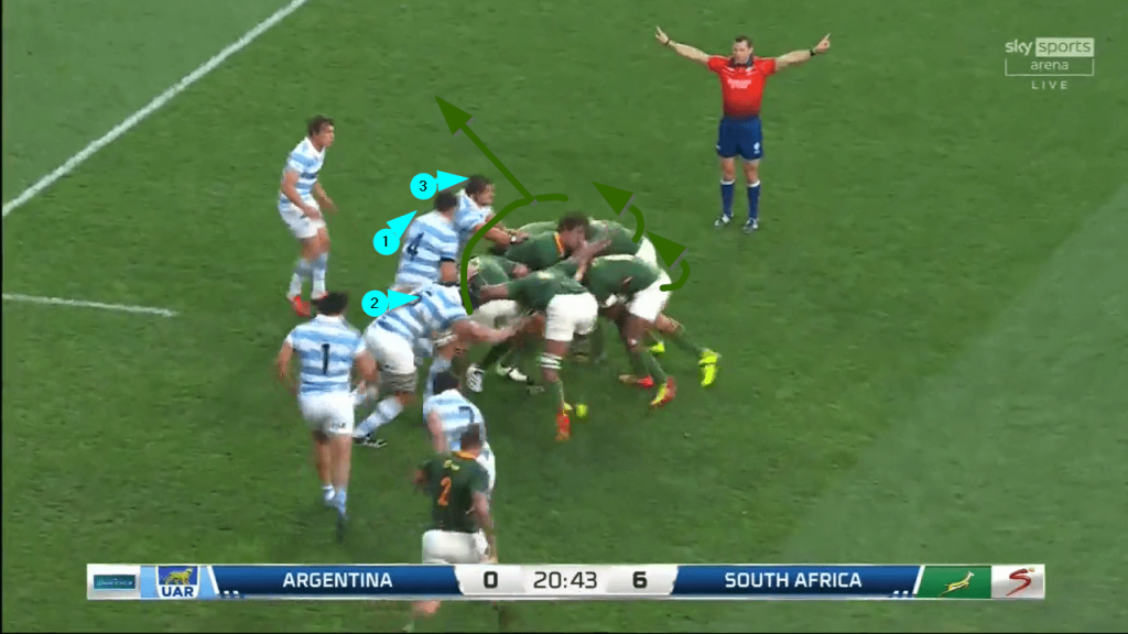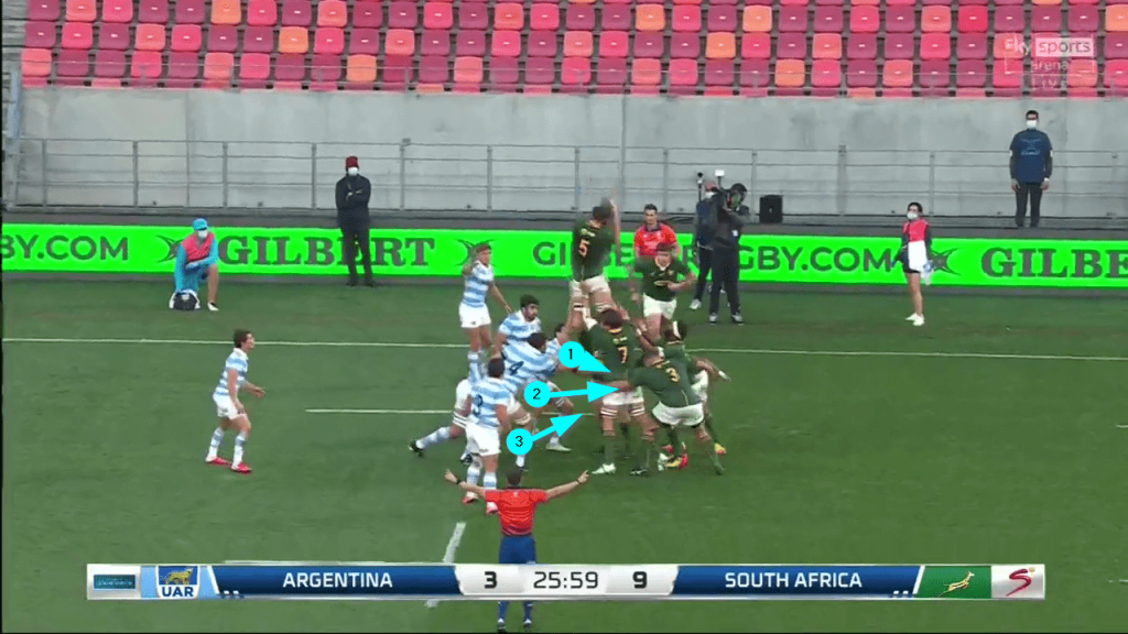 Once South Africa make the receipt at the back, it means 10-15 metres automatic progress because none of the Argentinian defenders are in a position to engage, let alone penetrate the blocking front as the maul forms: