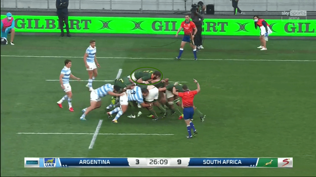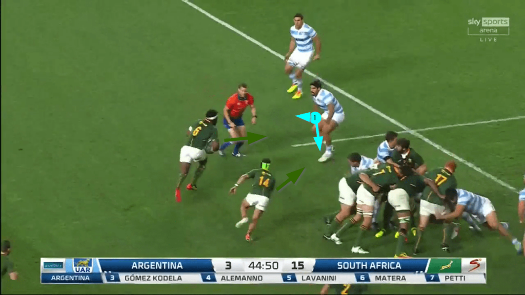 The throw goes beyond Petti at the front and Argentina’s forwards find themselves overworked on the infield corner, leaving Siya Kolisi and Cheslin Kolbe with an easy two-on-one in that area: