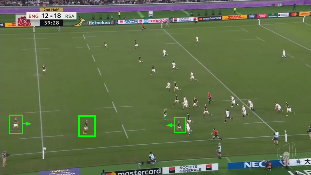 In both instances, the Springboks are well-placed for the counter on the England 40-metre line. One phase after Vermeulen made the second catch, the first leak in the English defensive dam appeared: