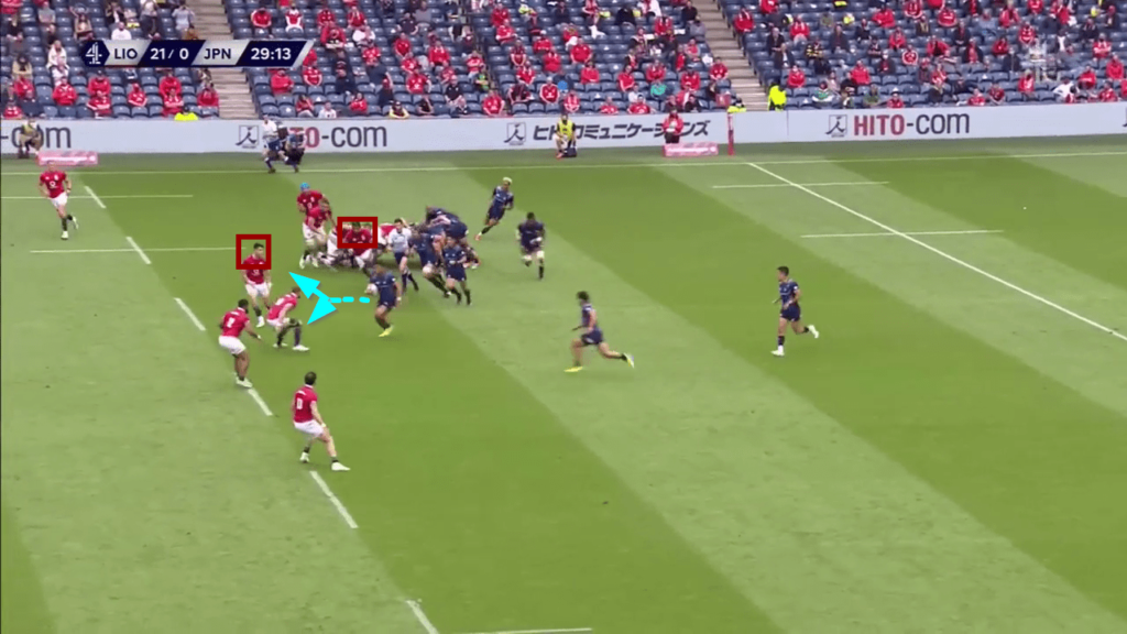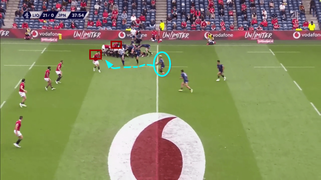 At the moment Matshushima receives the ball from his half-back, the Lions’ openside flanker, Taulupe Faletau, has not even raised his head, let alone detached from the set-piece, leaving the defensive scrum-half, Conor Murray, with ten metres of space to defend. For an attacker with Matsushima’s quick feet, that is too big of a gap for Murray to cover.