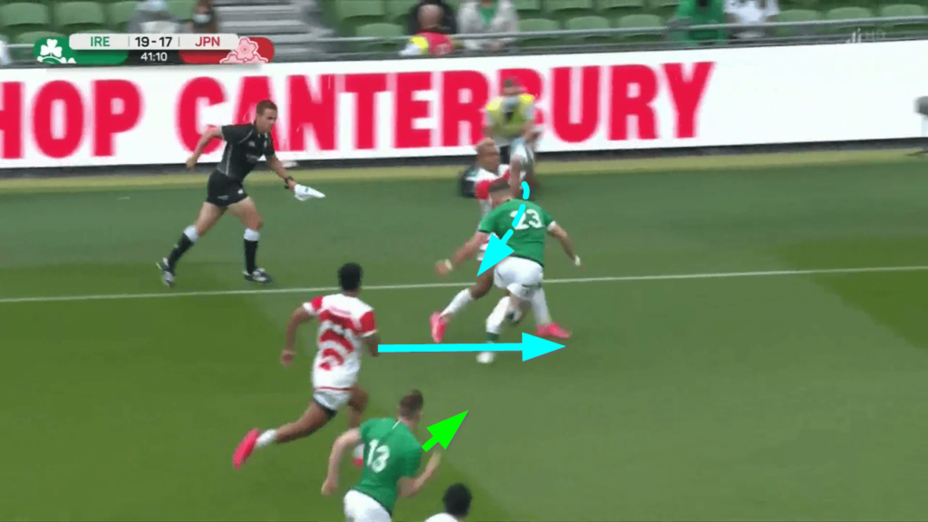 In this instance, Ireland have been forced to pull their fullback into line earlier to combat the quick width off channel one Japan, and that means nobody at home in the emerald green backfield for the following phase. A beautifully nuanced kick-through provides the gloss on the score after the break is made.