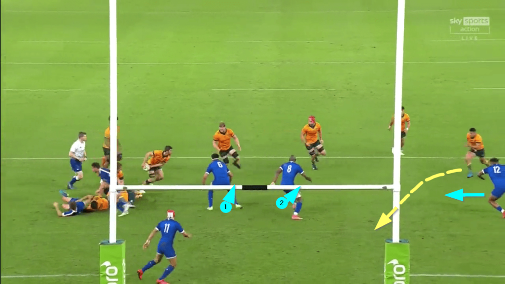 The knock-on effect on the following play is that only two French forwards, rather than the typical three, have made it around the corner of the first ruck: