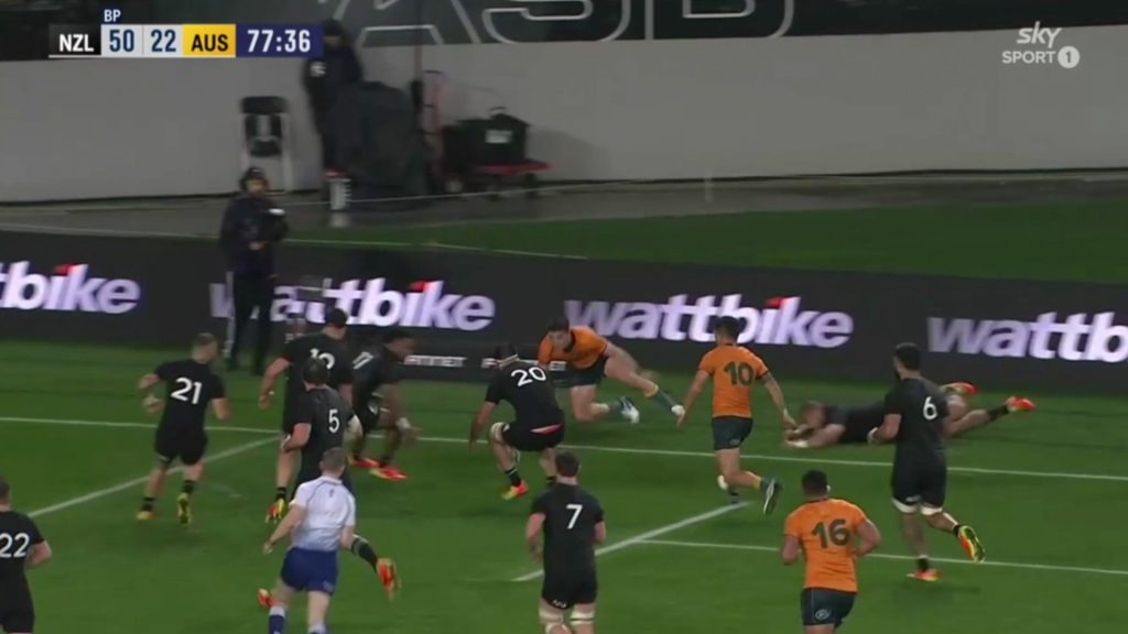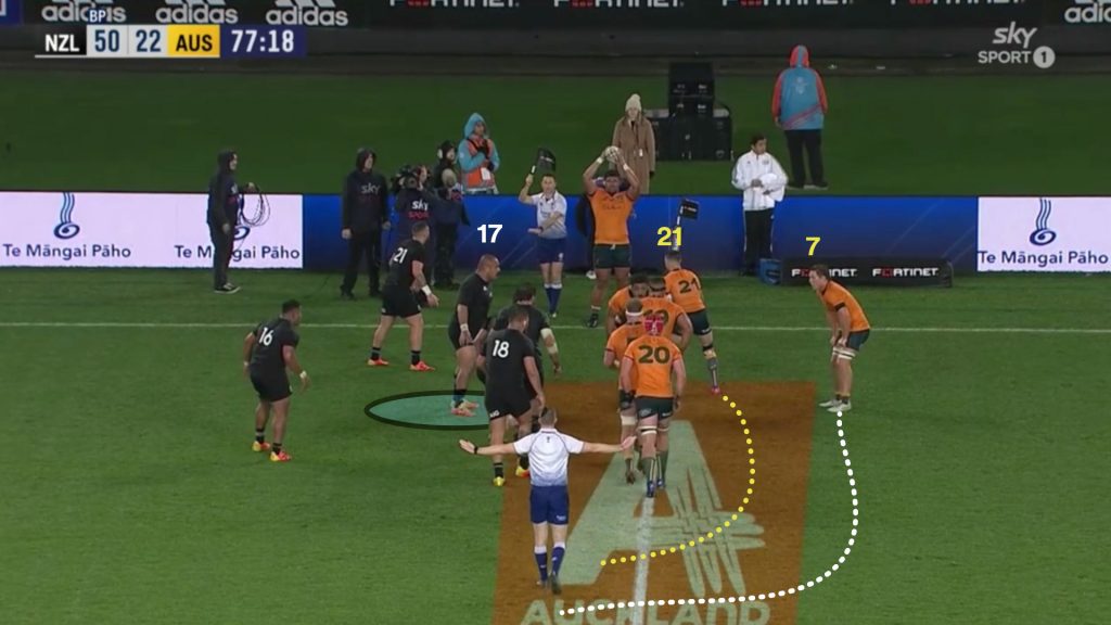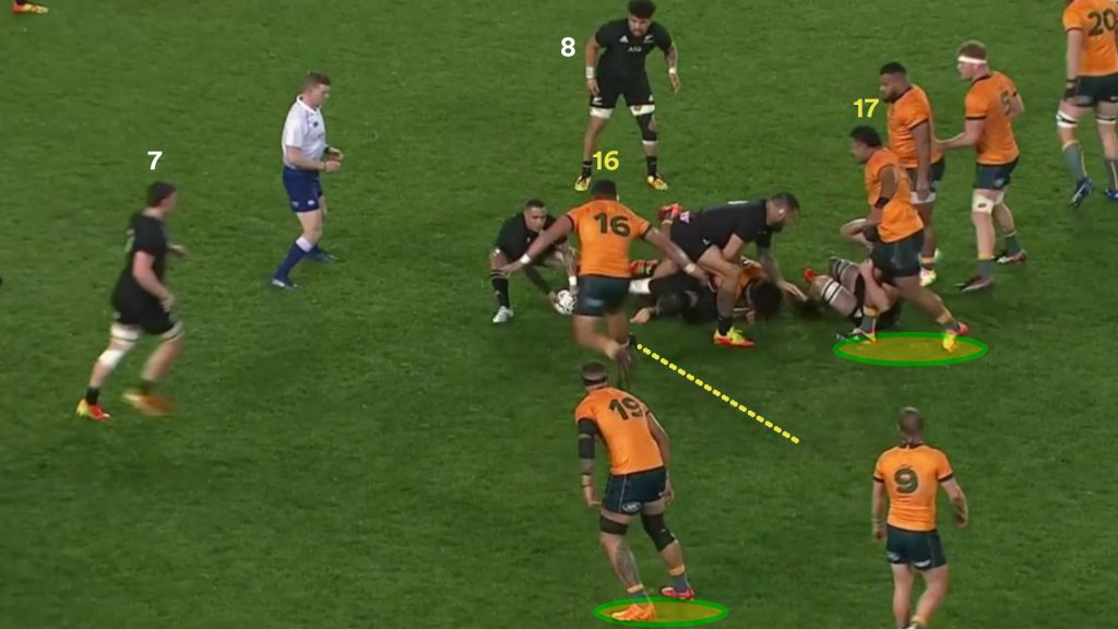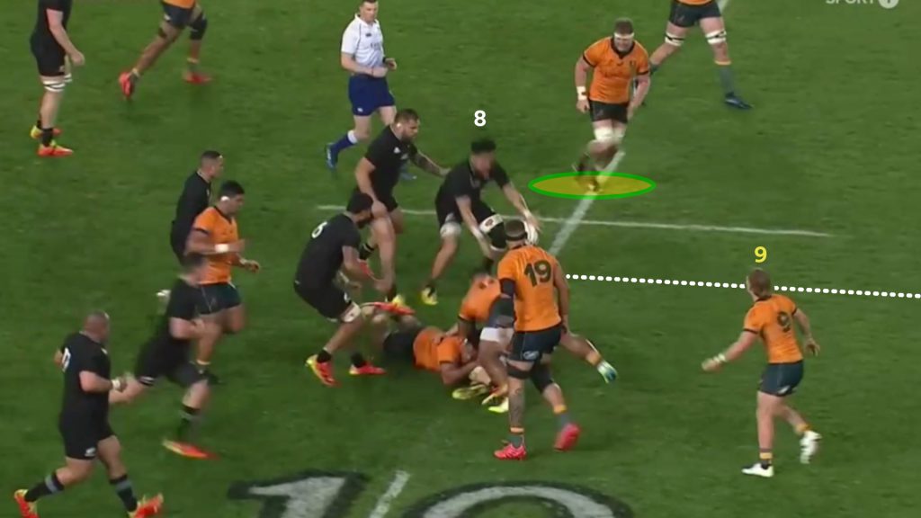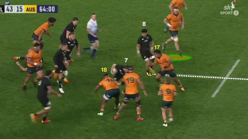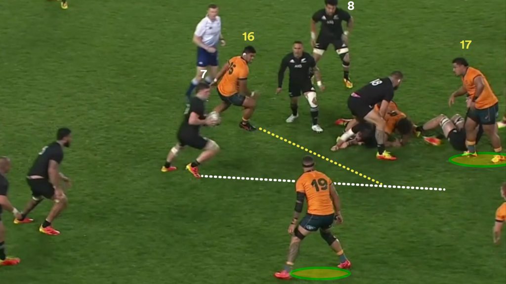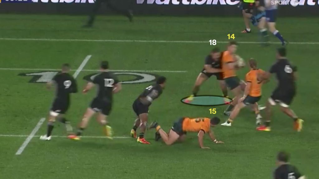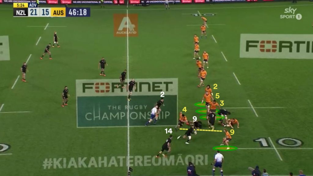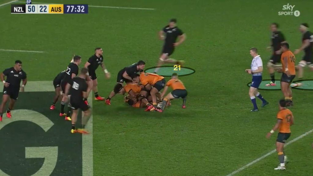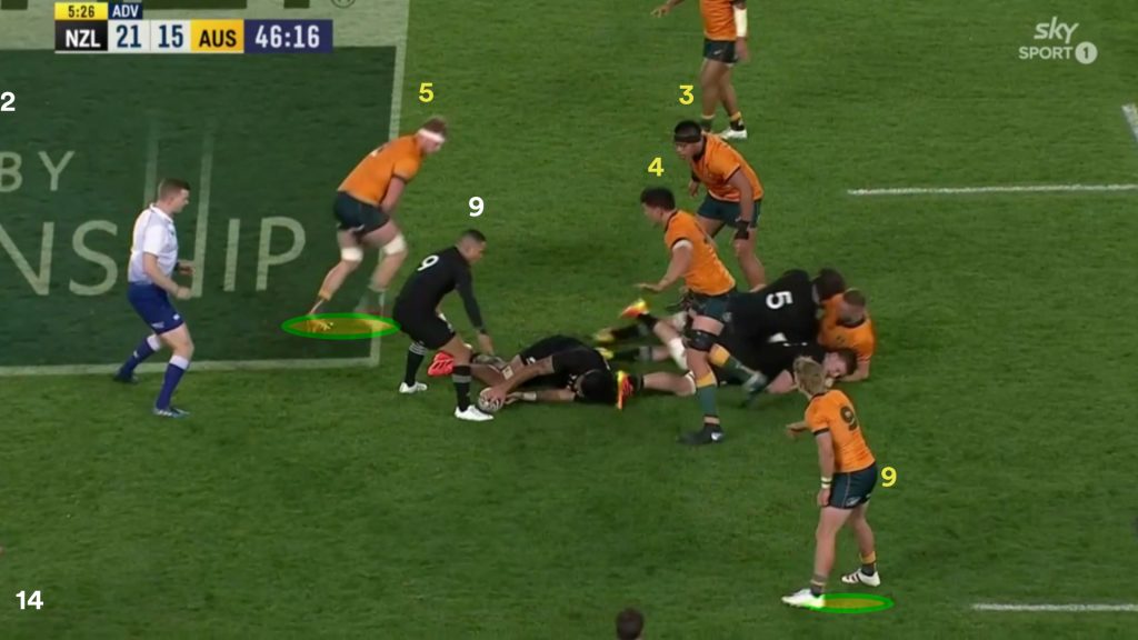 Patrolling the ruck, young Wallaby lock Darcy Swain (4) made a crucial decision to leave his pillar defence role. Clearly, this was an error of judgement but as the play unfolds the Wallabies make it easy for the All Blacks.