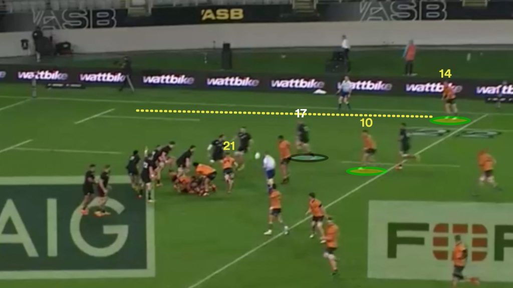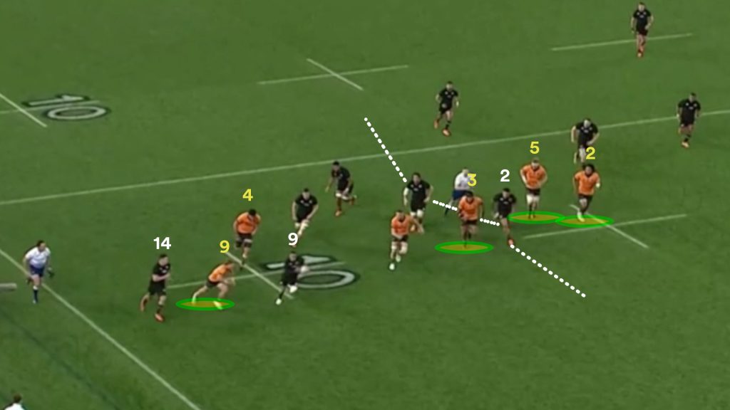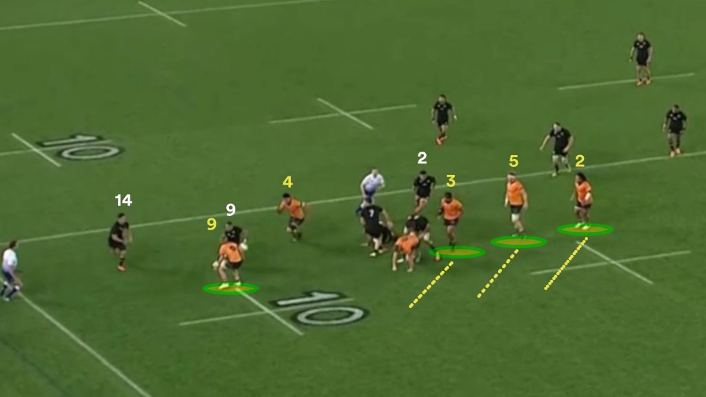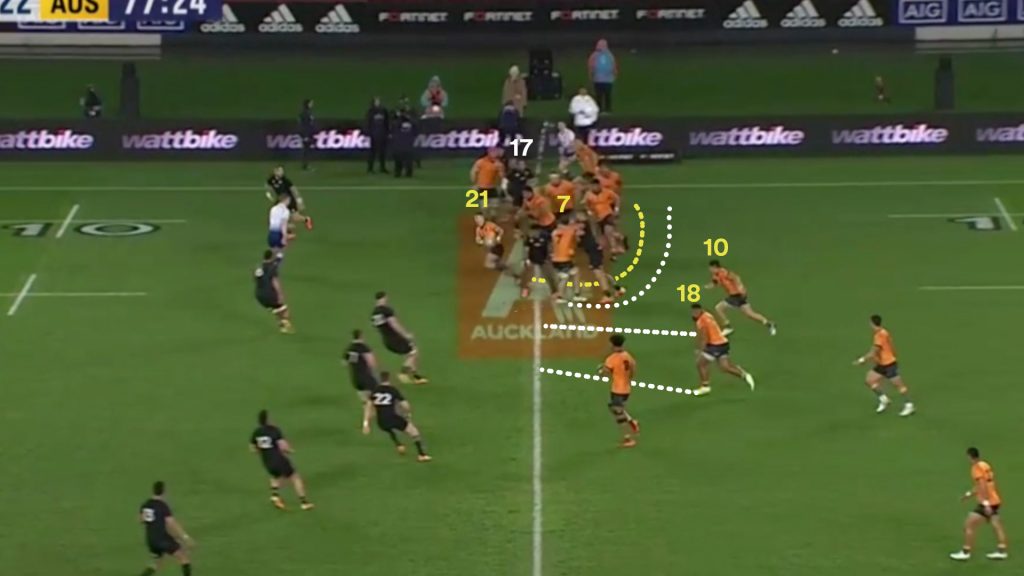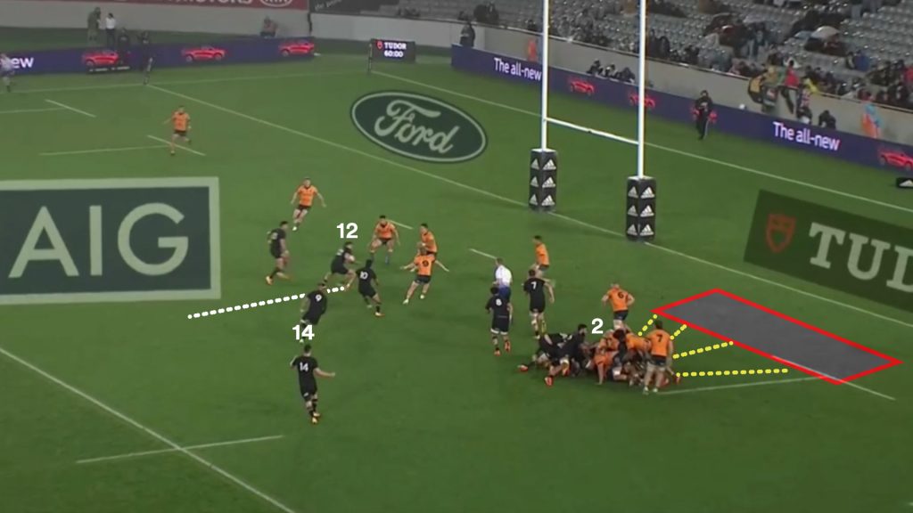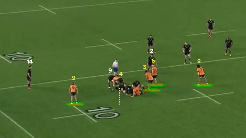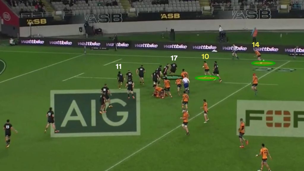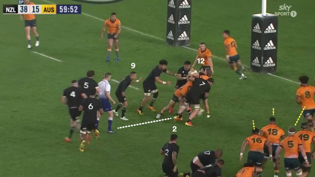 On the first phase David Havili (12) carries into the Wallabies 10-12 channel to set up a ruck for the switch. Aaron Smith is right in behind him searching for quick ball while Codie Taylor is up on his feet ready for the switch.