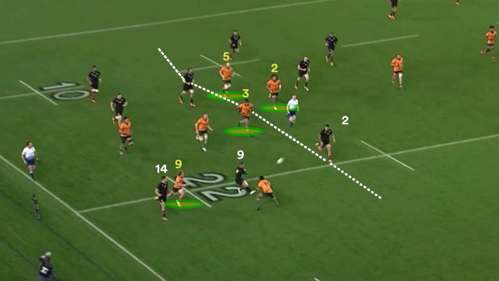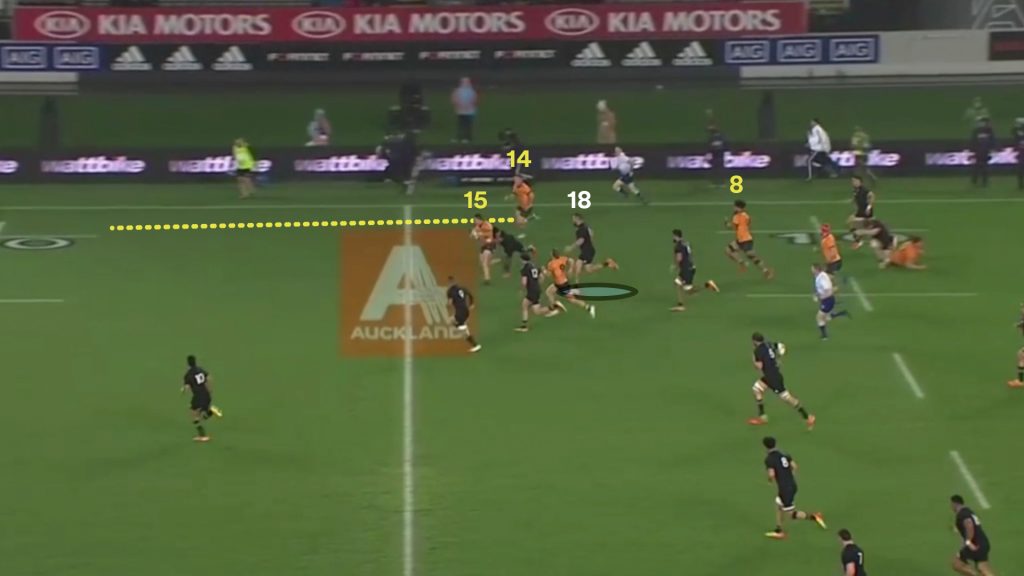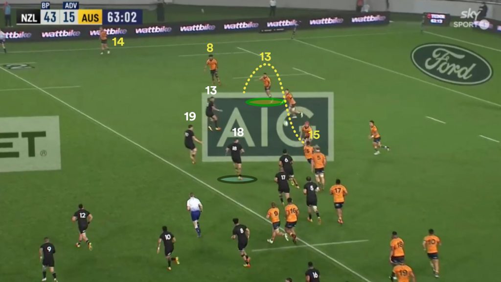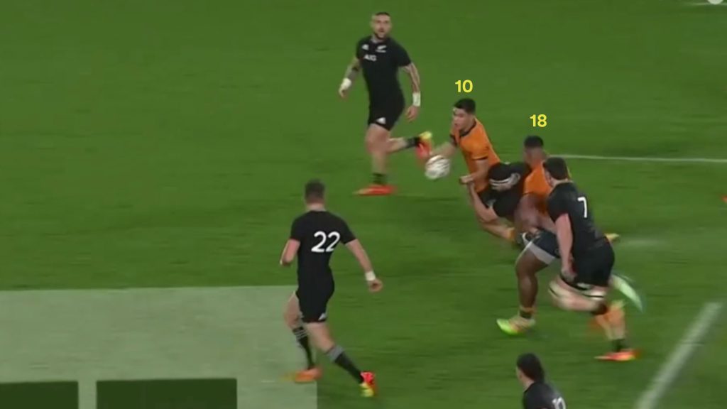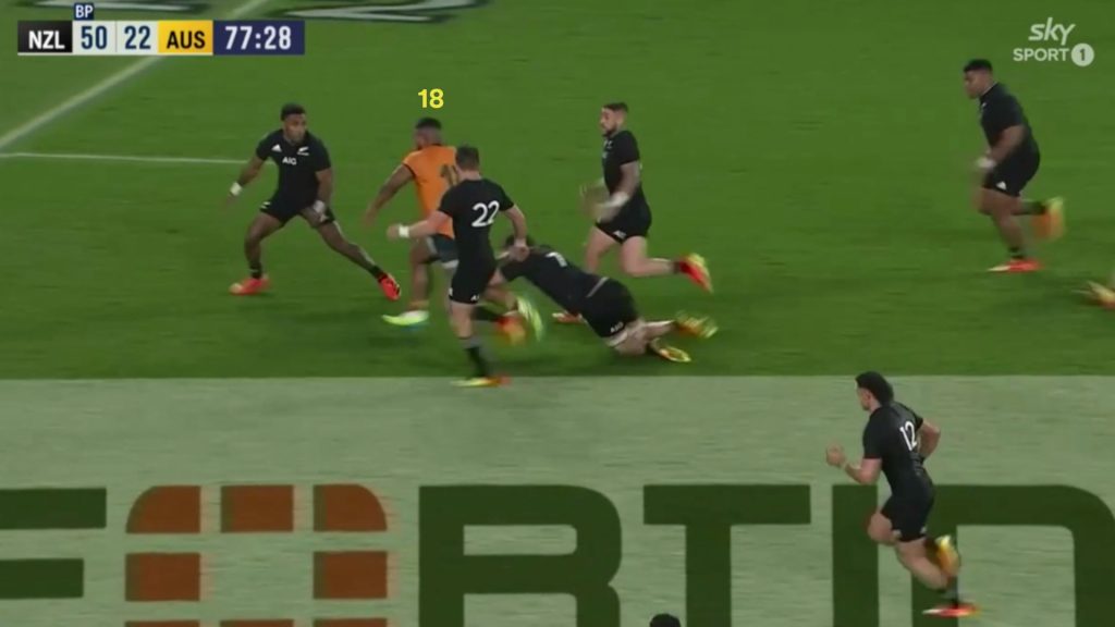 In one such case after winning a turnover, Tom Banks (15) fires a long ball over the top to Hunter Paisami (13) where the All Blacks are thin on the ground. Inside Rieko Ioane (13), the All Blacks have lock Scott Barrett and prop Angus Ta’avao (18) and the Wallabies clearly have the numbers advantage to spark a counter-attack.