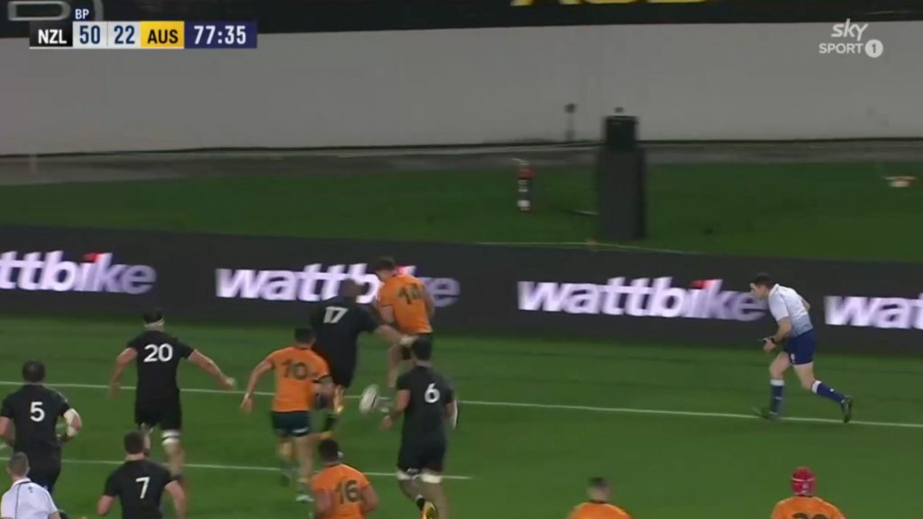 The last man in the chain is prop Karl Tu’inukuafe, who ends up being the last defender on the edge as Kellaway is left completely unmarked. Once again it is an All Blacks prop trying to chase down a Wallabies wing.