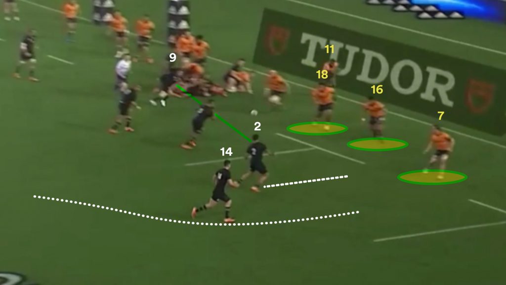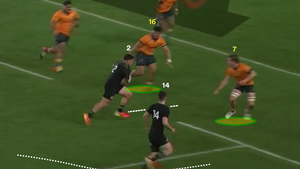 The man that does get to Dalton Papalii (7) first is Taniela Tupou (18), from the opposite side outside Sio, but he fails to bring him down on the first contact. The support runner, Ardie Savea (8), finds himself open, as lock Matt Philip doesn’t work off the ball to keep him covered.