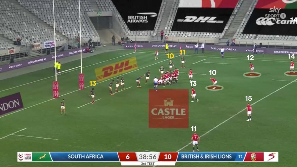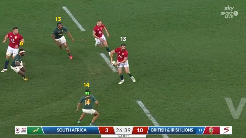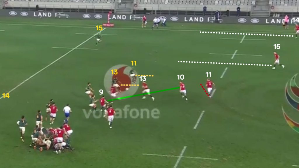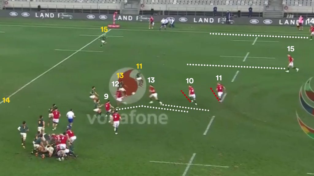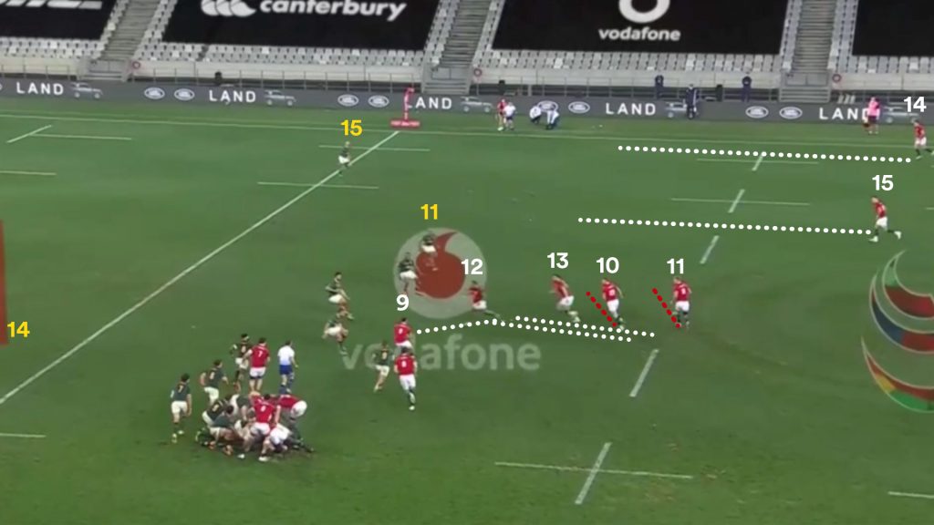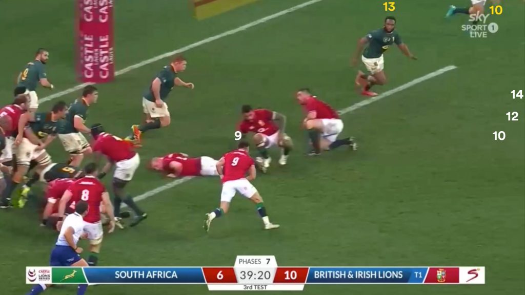 Once again the Lions don’t use the full width of the field and fail to fully capitalise on breaching the Springboks out wide. Aki (12) becomes a meaningless support player and the numbers aren’t effectively used.