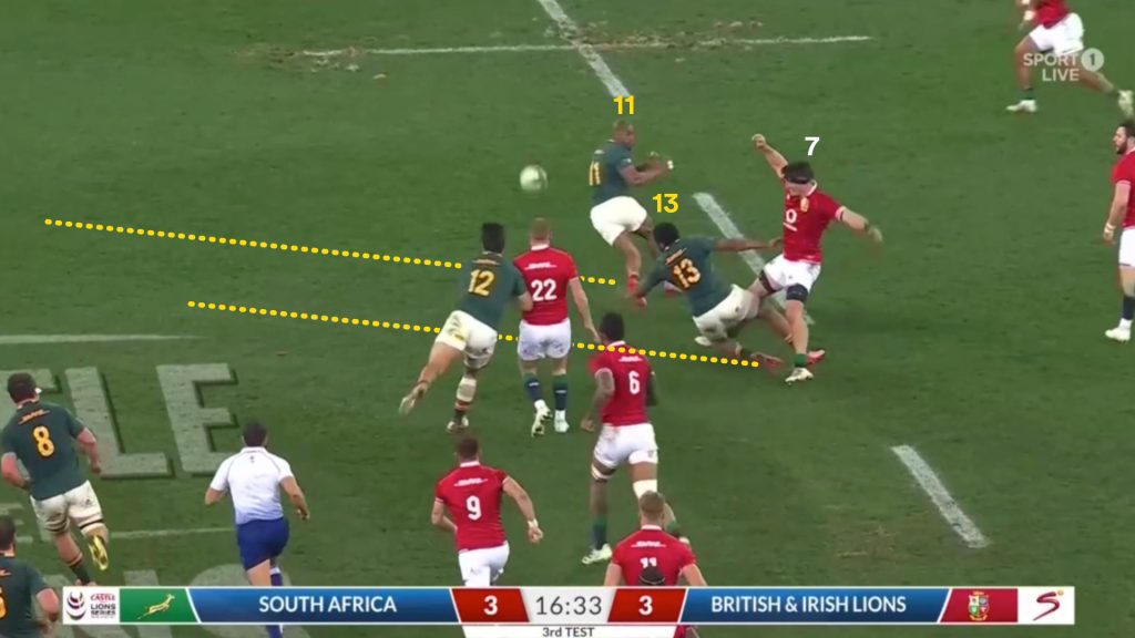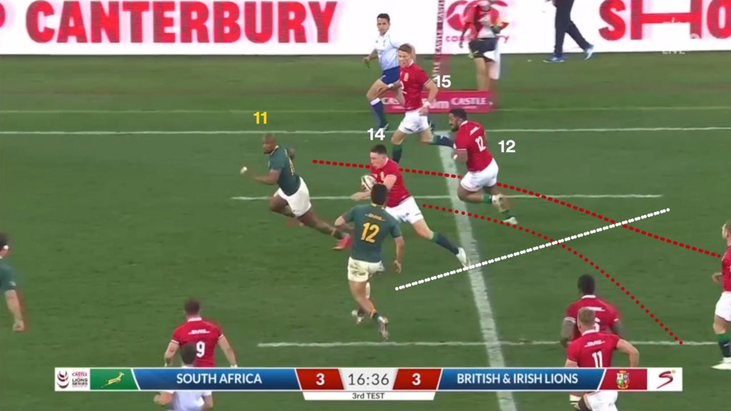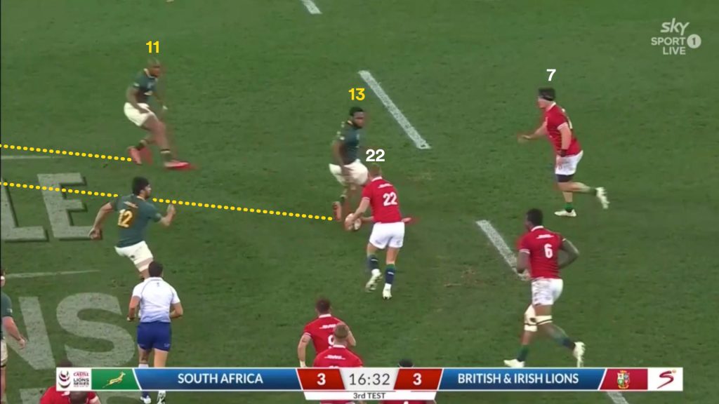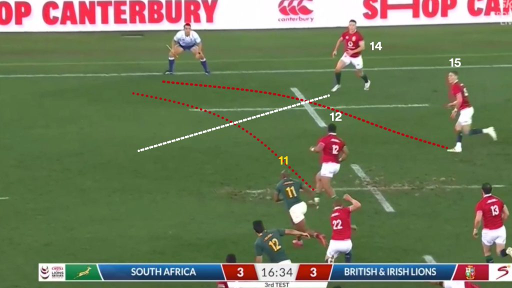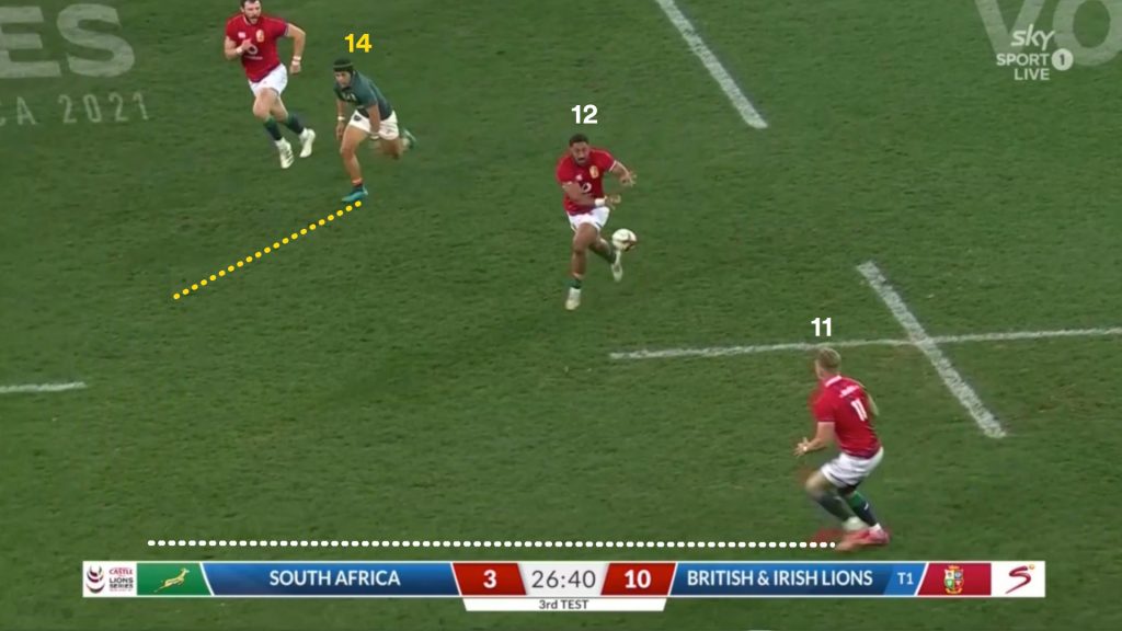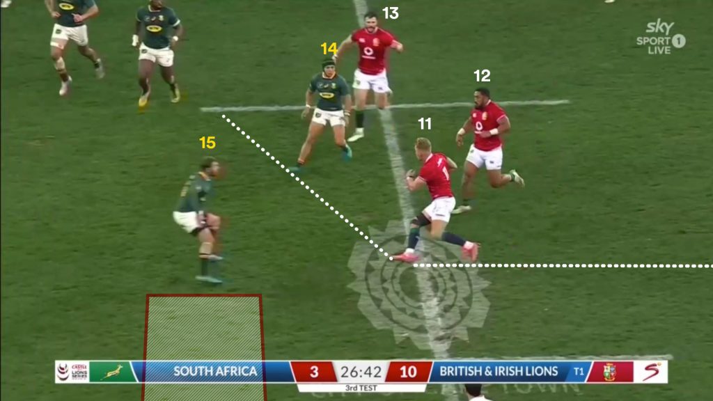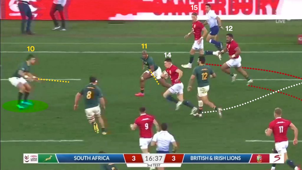 When the ball moved outside of last front line man, Kolbe (14), the Lions needed a genuine outside centre or fullback to crystallise the two-on-one and set Duhan Van der Merwe (11) free.