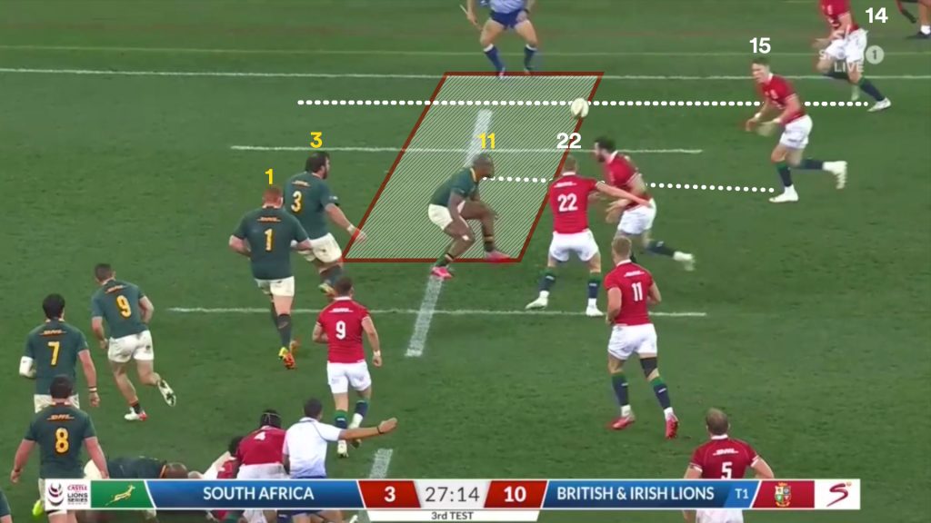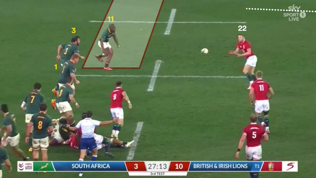 We know the last defender is Mapimpi outside Pollard, so its a three-on-three situation across half the width of the field. If Williams moved over there, it’s four-on-three in the Lions favour.