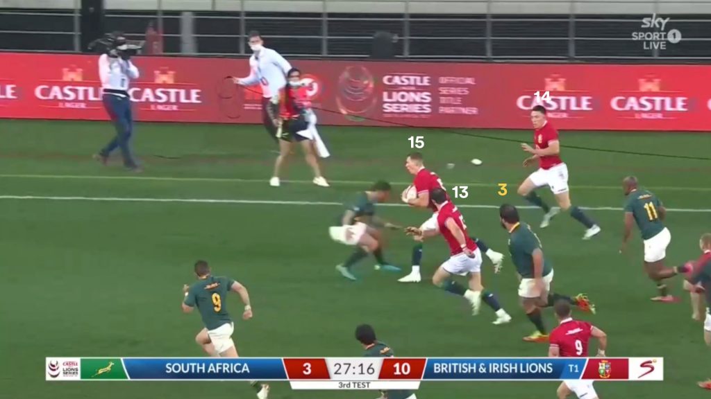 We don’t get a wide shot after this one during the build-up, but we can gather that Pollard (10) and Mampimpi (11) are the last two defenders on the left edge and that the Lions have Aki (12) and Adams (14) out that way.