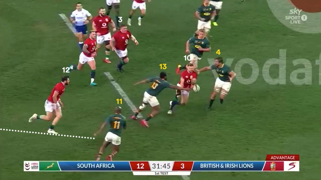 Henshaw (12) is given a lane to rip through the line and only a great cover tackle by Le Roux (15) prevents the Lions from delivering a strike on the stroke of half-time.