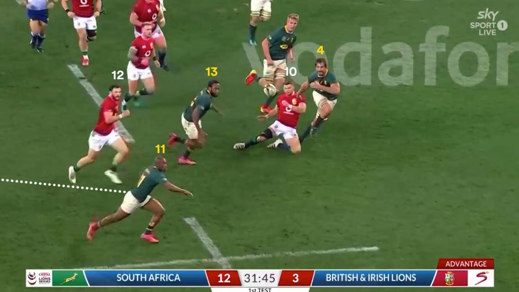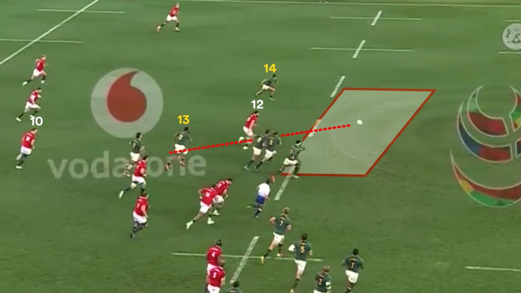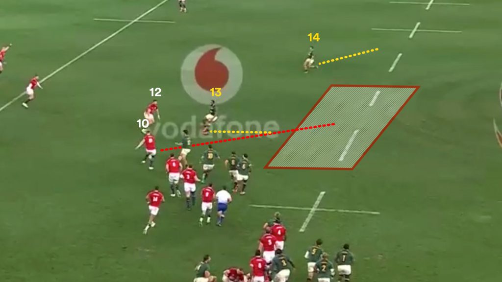 The Springboks outside-in edge defence is a cornerstone of their containment system, which looks to funnel play back inside at all costs. When Am shoots up, his wingers outside are tasked with the clean-up job, also rushing up to shut play down should the ball get past the centre.