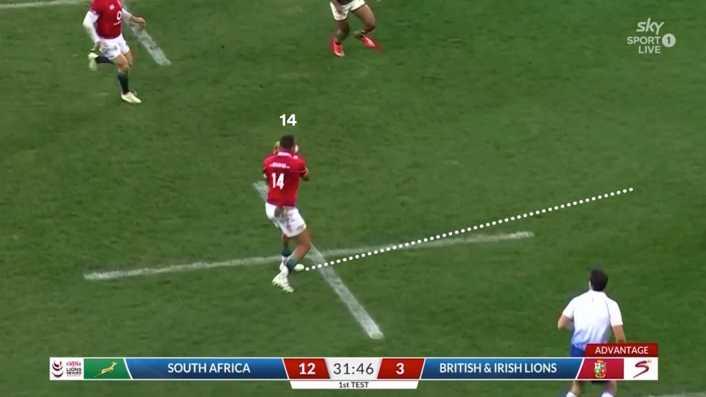 Delaying the release to ensure Am and Mapimpi were past him, Biggar thread the needle behind their backs, throwing a diving cut-out pass out wide to the free man Anthony Watson (14).