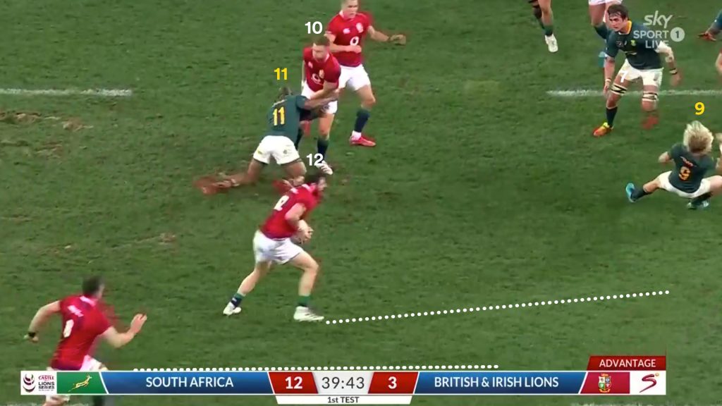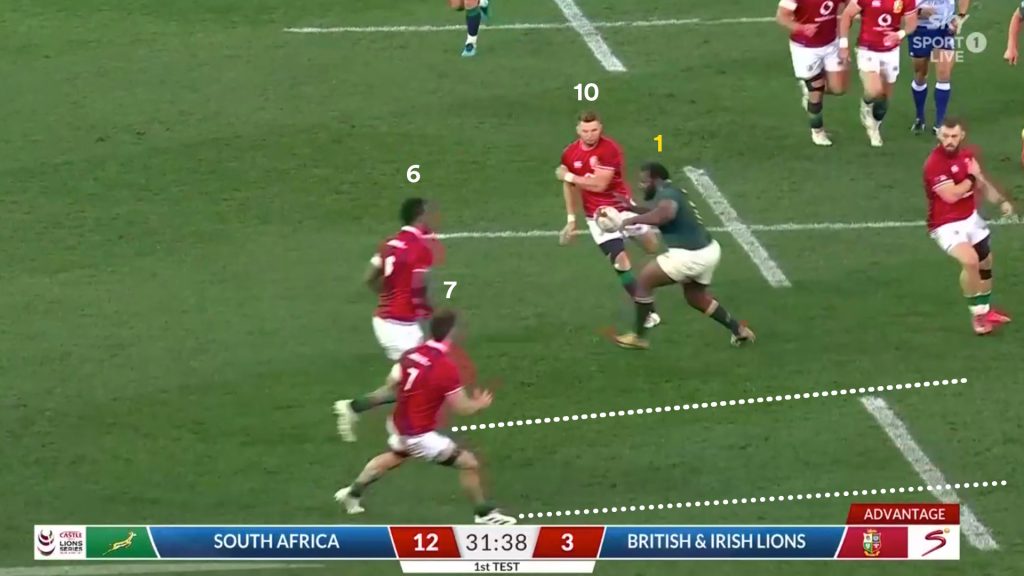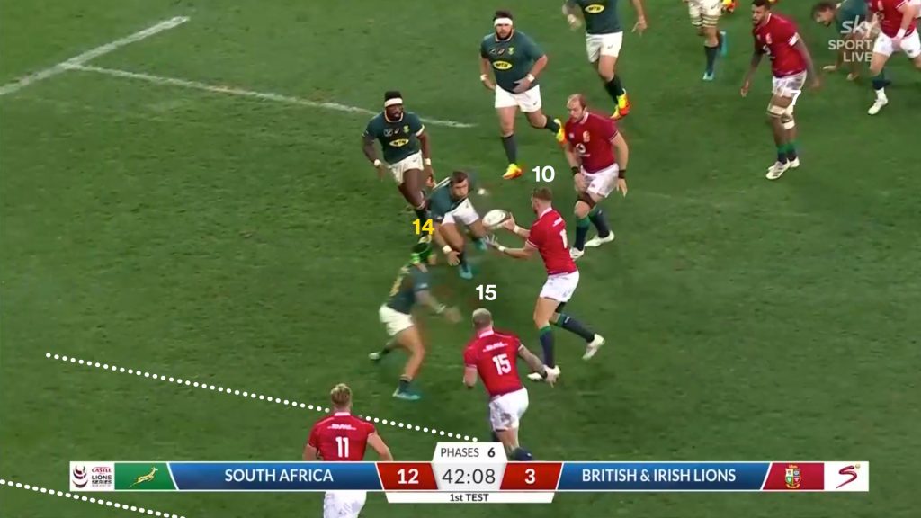 The colossal hit resulted in a huge gain-line loss for the Lions and, under ruck pressure, they lost the ball as the Springboks piled in to flood the breakdown.