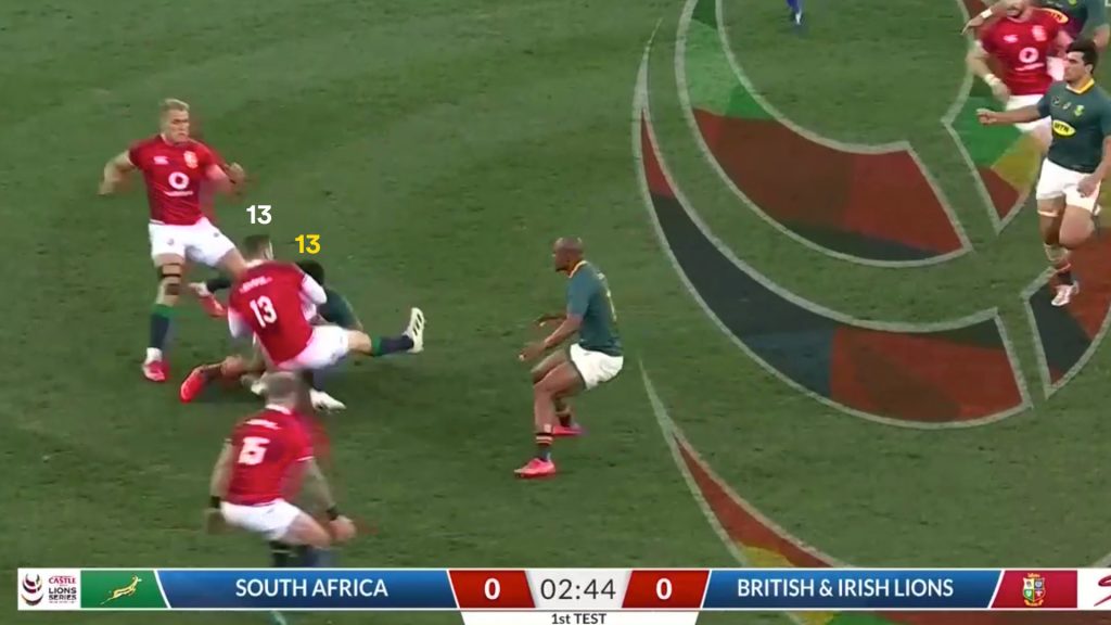 As quick as the transfer was, Lukhanyo Am was even quicker, smashing the Lions centre almost on receipt of the ball.