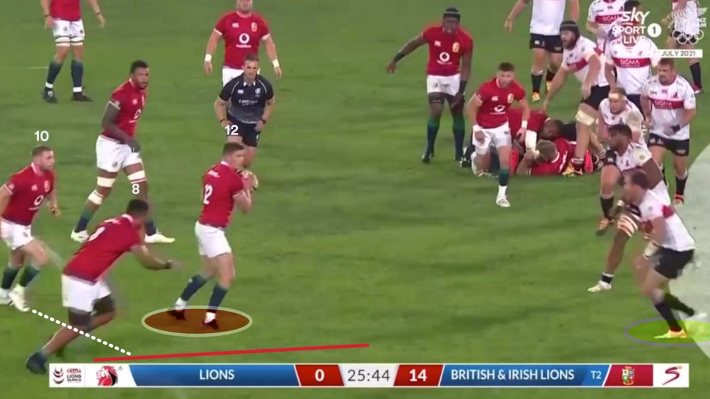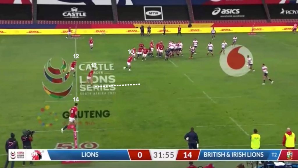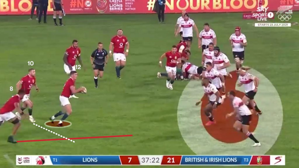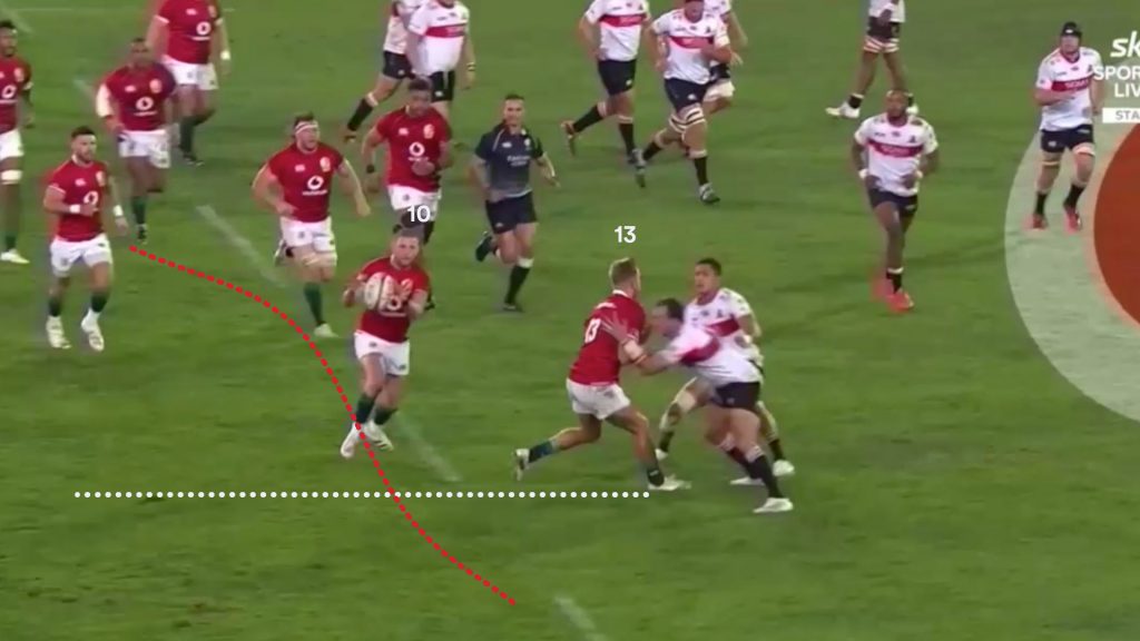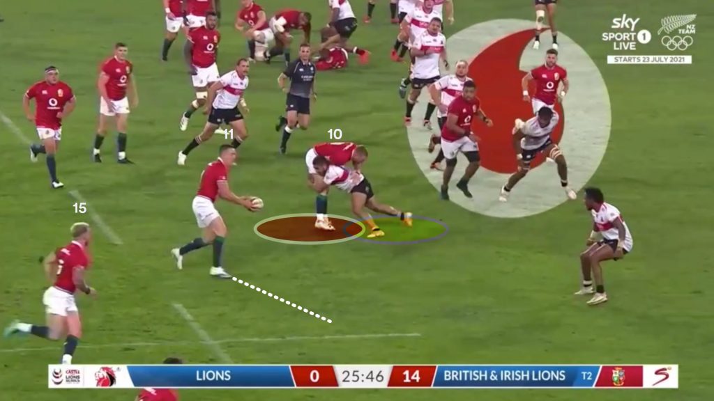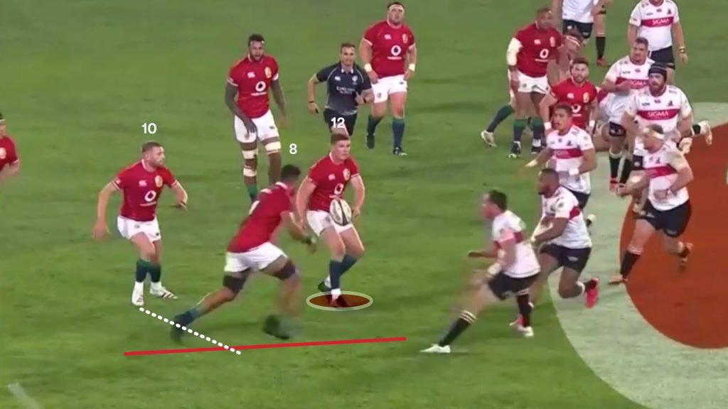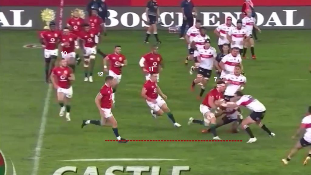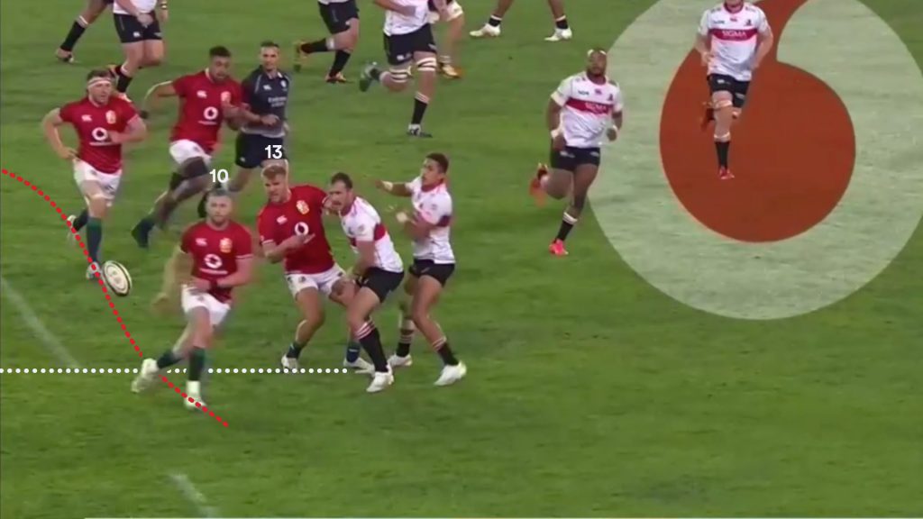 Watson’s strong carry gave the Lions a good platform to use the miss pass, and on the next phase the same way that is exactly what Finn Russell (10) tries.