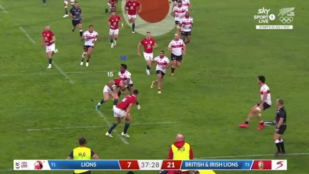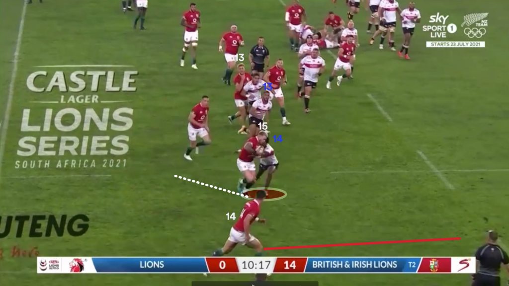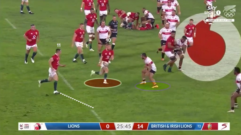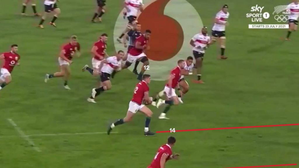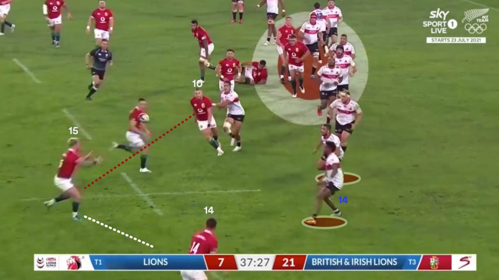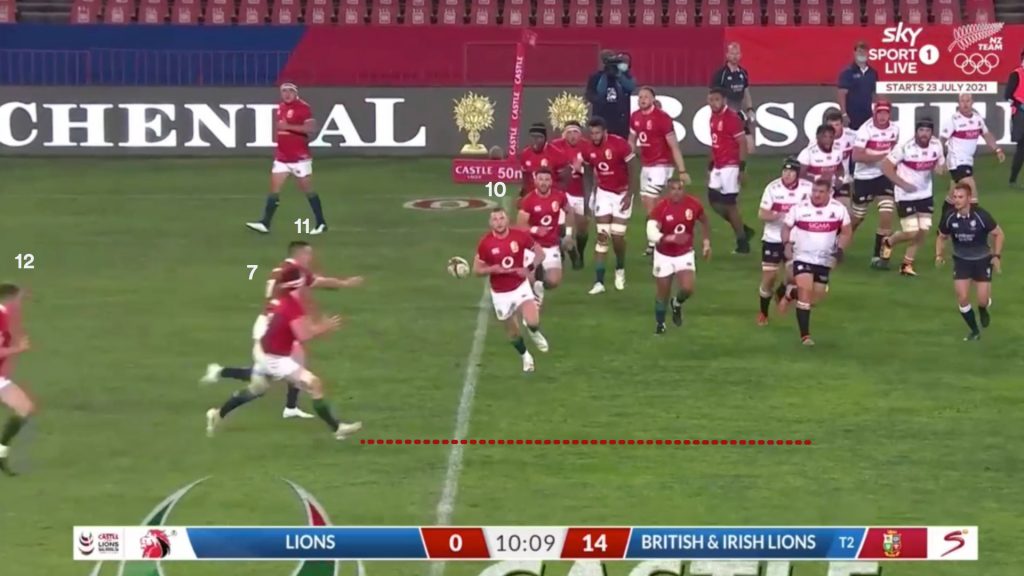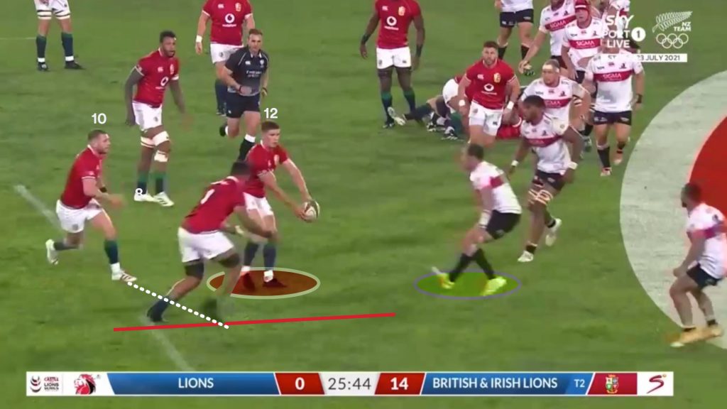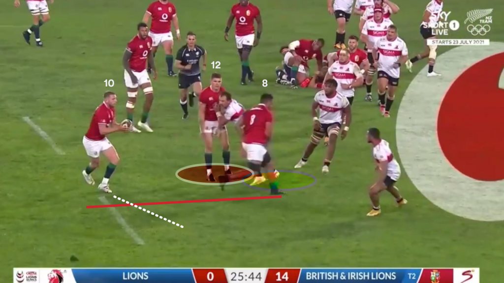 Watson’s strong carry gave the Lions a good platform to use the miss pass, and on the next phase the same way that is exactly what Finn Russell (10) tries.