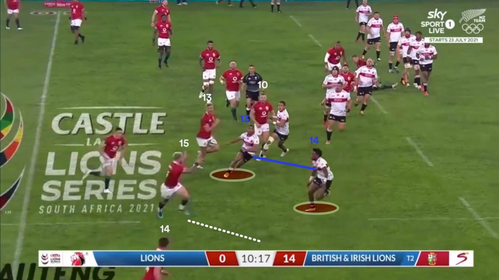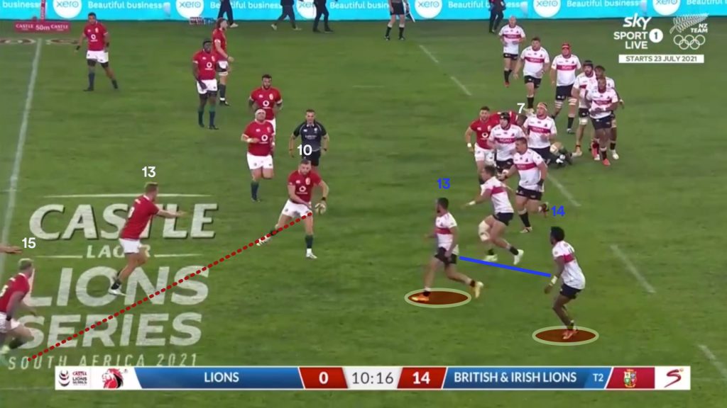 The British & Irish Lions used a two-phase quick hit launch play on multiple occasions to target this open-side defence against the Sigma Lions, also trying to beat the catch-up defender with the skip-pass. It could be a tactic they are working on for the Test series.