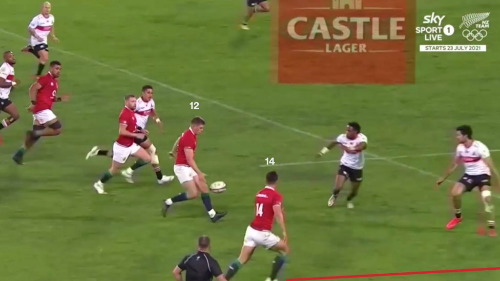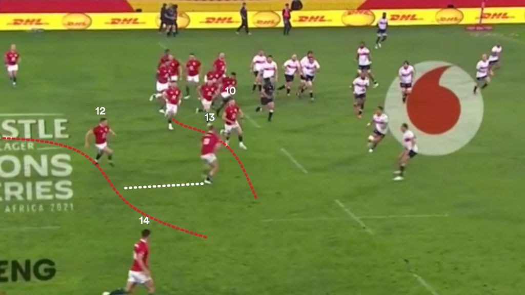 On another deliberate overthrow to Harris from the lineout, the Lions slip into the same shape on the second phase. Farrell’s pullback pass draws contact from the front-line defence and Russell is offered a comfortable opportunity to make a play.