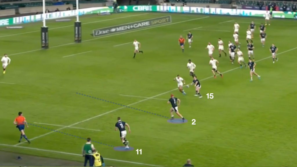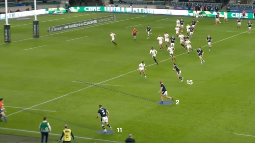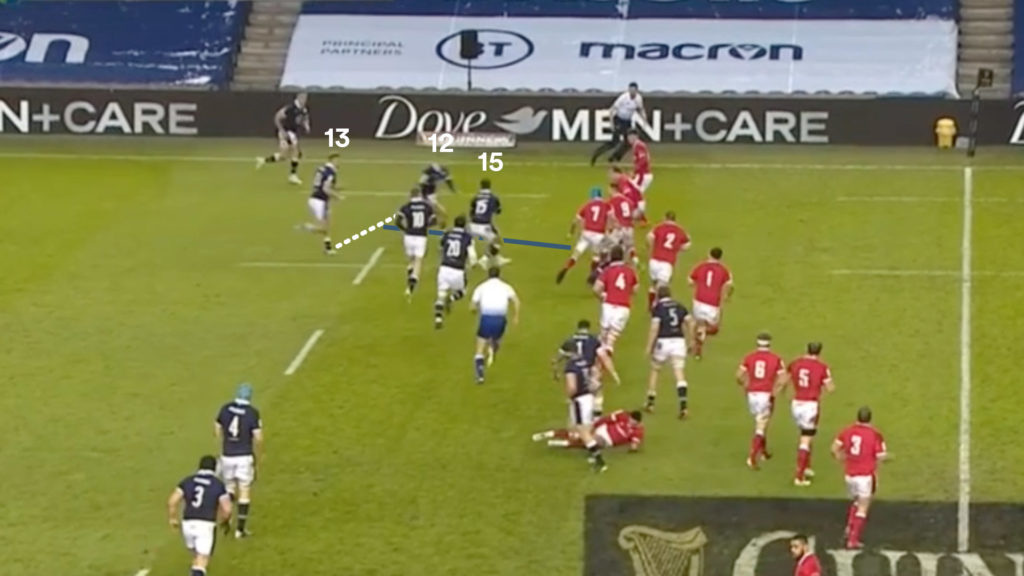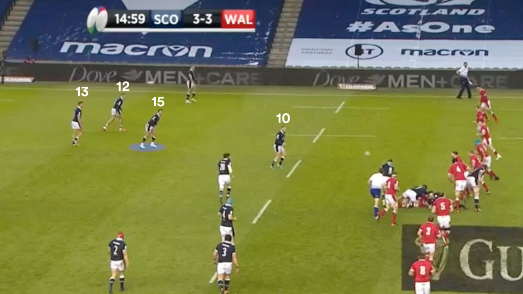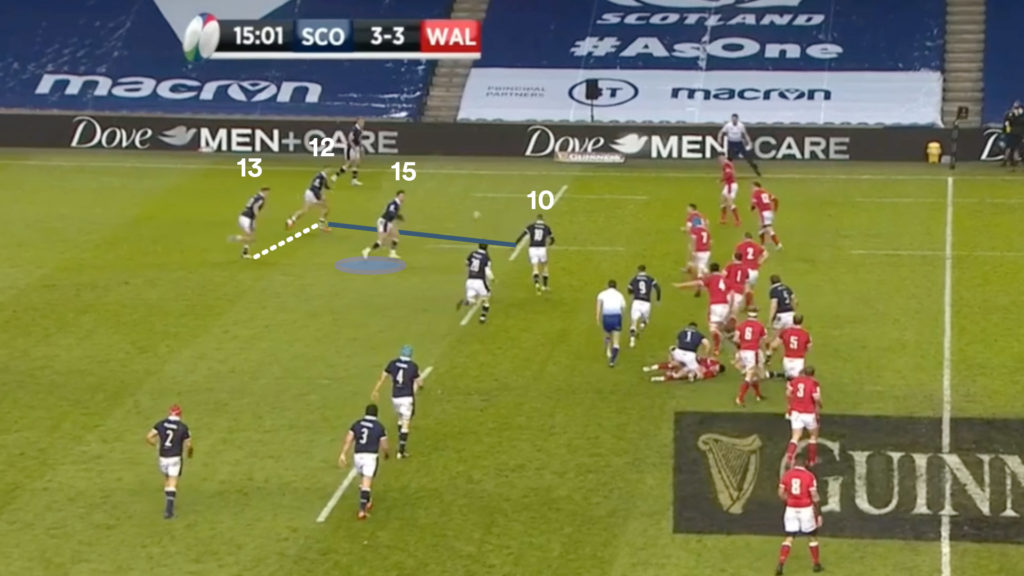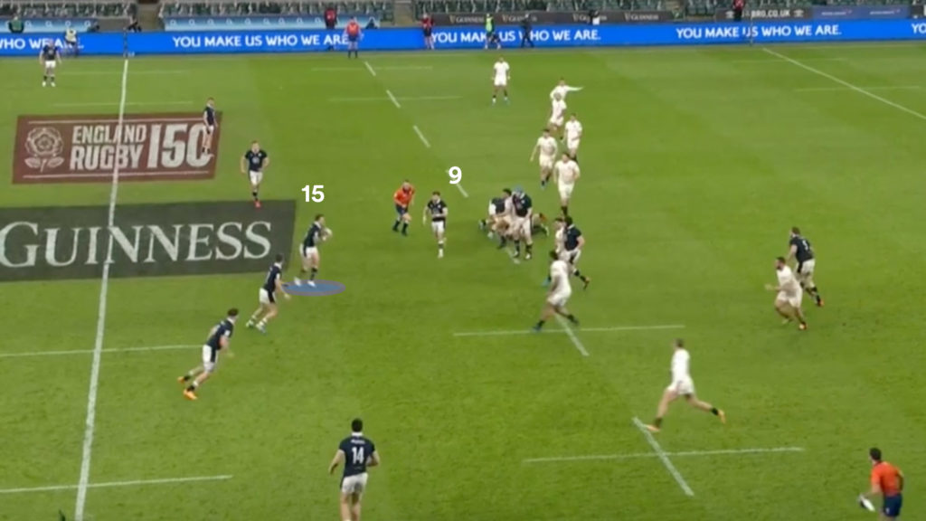 Against Wales below in this year’s Six Nations, the full-back is set up deep outside Russell for a play structured around Hogg as a second-receiver, playmaking option.