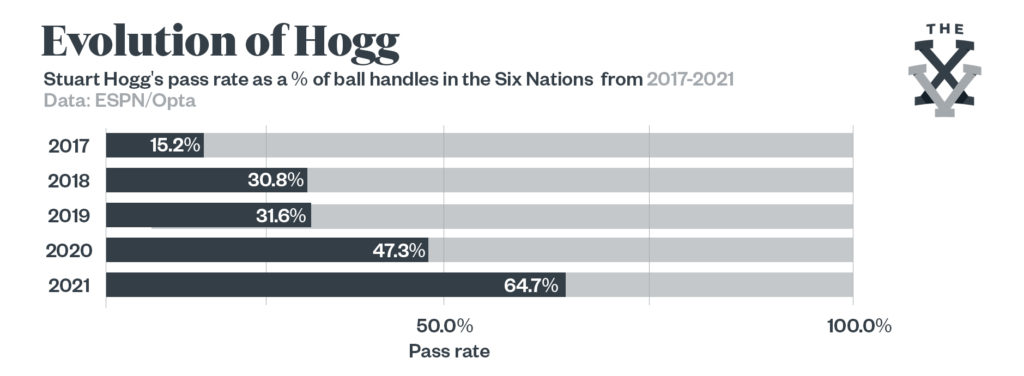 Nothing illustrates Hogg’s transformation more than the volume of passing that he is now undertaking in Scotland’s attack. Since 2017, Hogg’s balance of passing as a percentage of his total touches has increased dramatically.