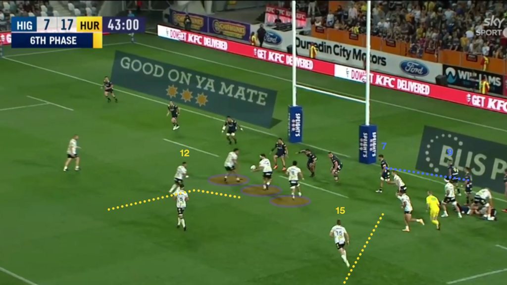 Before the Hurricanes struck gold with their first try using this pattern, we see Ngani Laumape (12) preparing to be the ball carrier on the strike line back inside. A defending Highlanders player actually points out Laumape as a threat and the Hurricanes opt to hold off on using the strike runner.