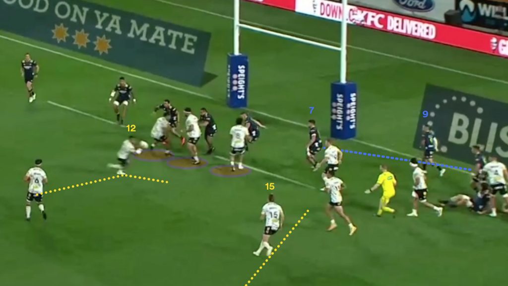 They have a well formed pod, with Jordie Barrett the game driver in the back. Both wingers have moved off the flanks, Salesi Rayasi (11) has positioned himself to be a strike runner and so has Wes Goosen (14).