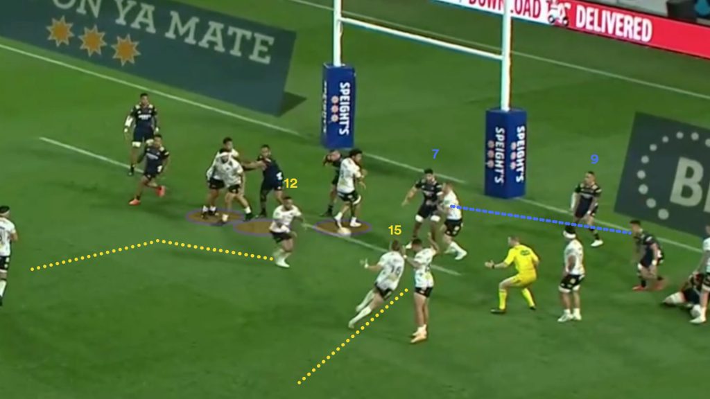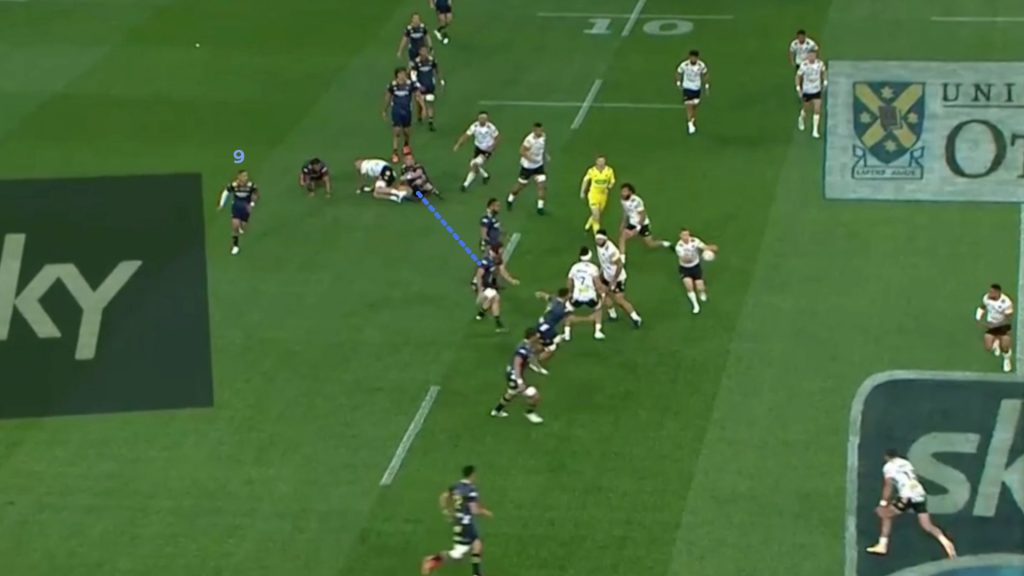 The play preys on the natural tendency of a defence to push and chase, particularly the interior defenders. As the ball is played to Garden-Bachop, the Blues interior defenders are pushing outward in anticipation of the ball continuing wider.