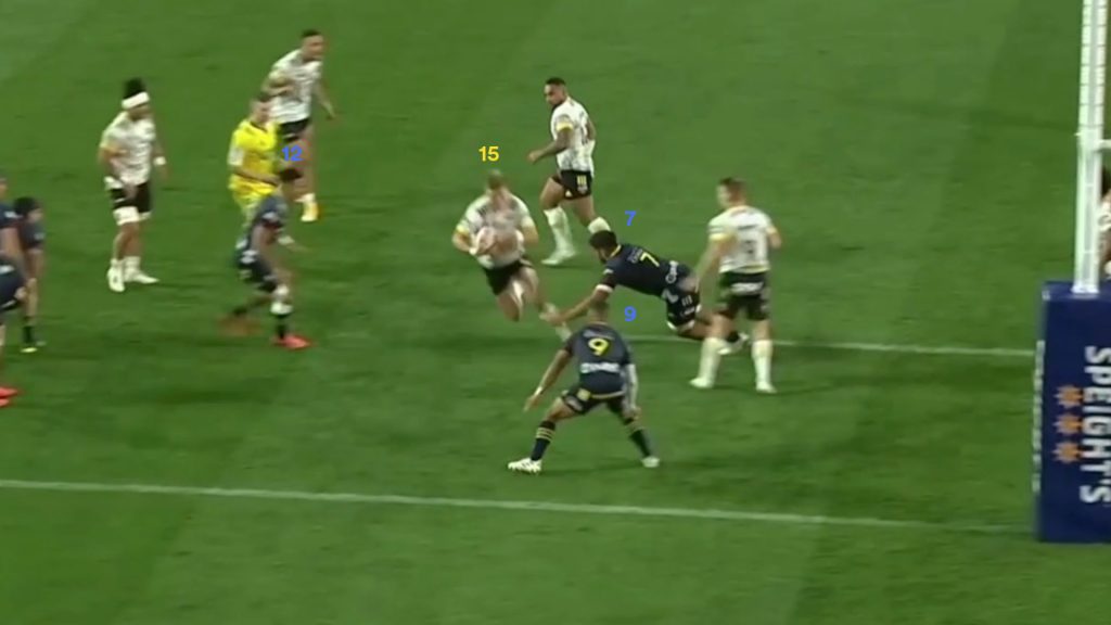 The Hurricanes would have no doubt understood his role as sweeper in behind the Highlanders defence, and that funnelling strong runners back through the gate around the ruck would send big men into his path.