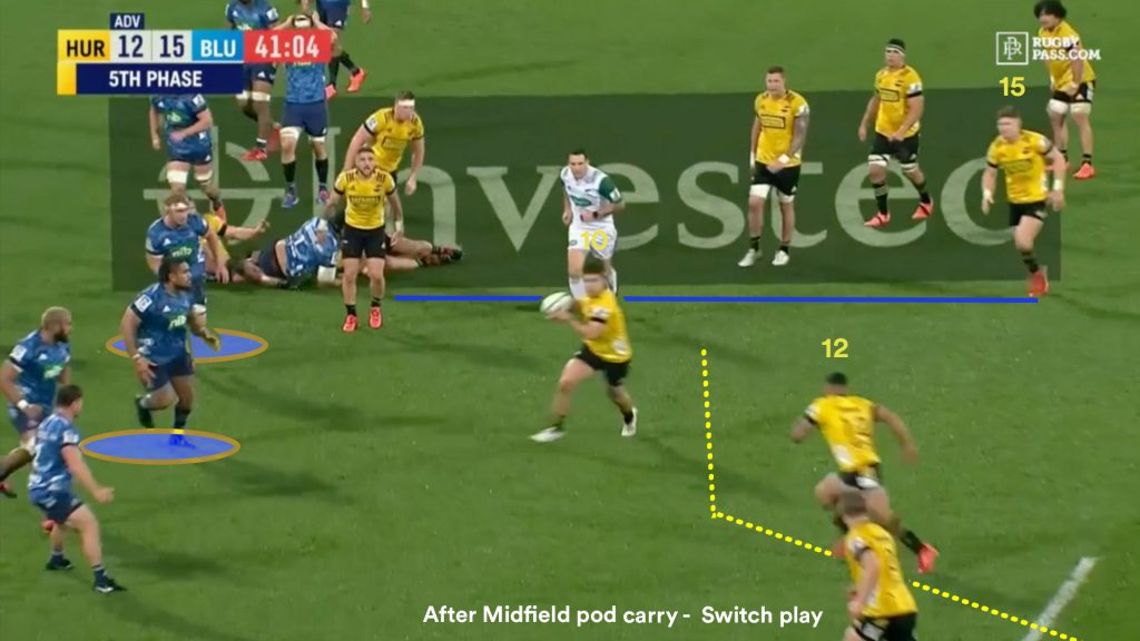 Against the Blues last year, the Hurricanes would use switches to funnel play back towards the ruck. In this concept, after getting the ball at first receiver, Jackson Garden-Bachop plays Ngani Laumape underneath on a switchback towards the ruck, then Laumape hits Jordie Barrett (15) steaming onto the ball through the ruck channel unsighted.