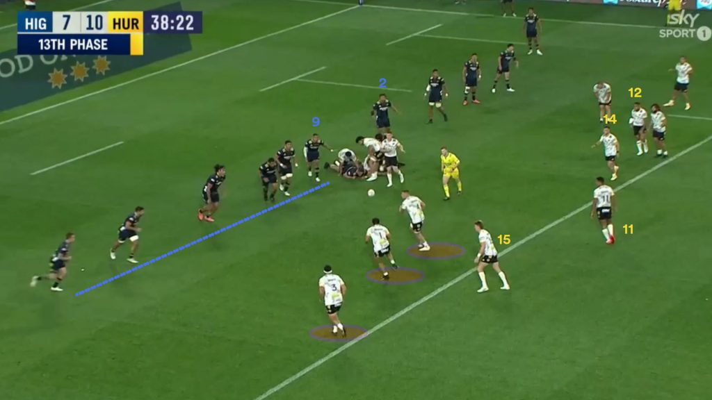 Early in the match against the Highlanders, a disconnect in the defensive line is clearly visible around the ruck as the Highlanders want to bring pressure at the Hurricanes pod. The presence of this would be exploited later in the half with a new Hurricanes pet play.