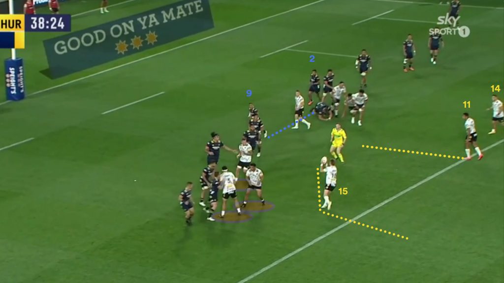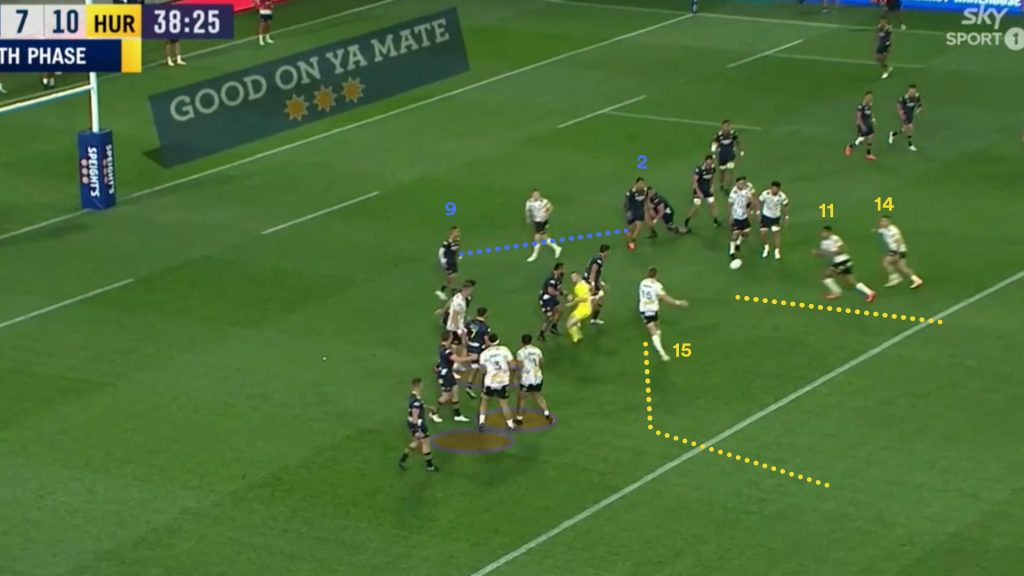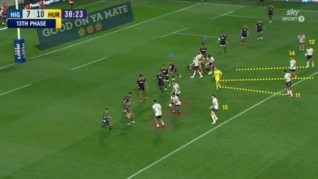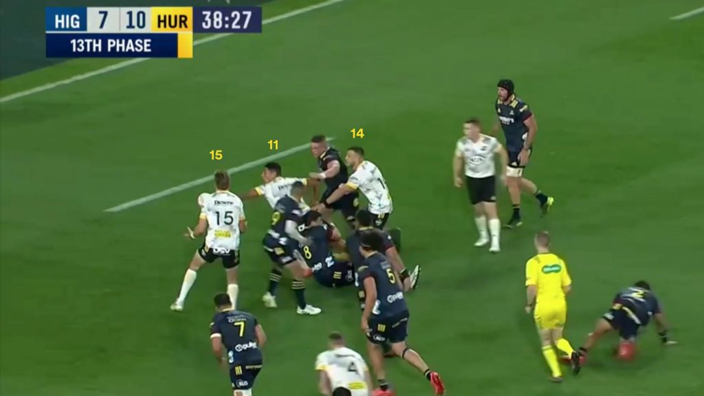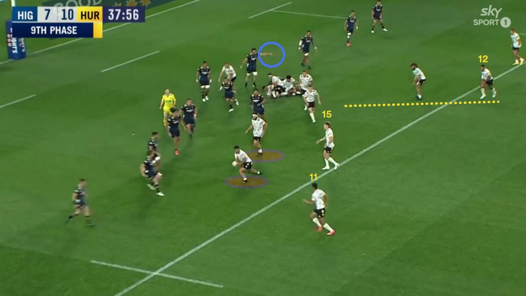 The Hurricanes have potentially three dangerous threats that can be fired into the Highlanders weak ruck channel if they wish to use them. On this occasion they send both wingers into the channel.